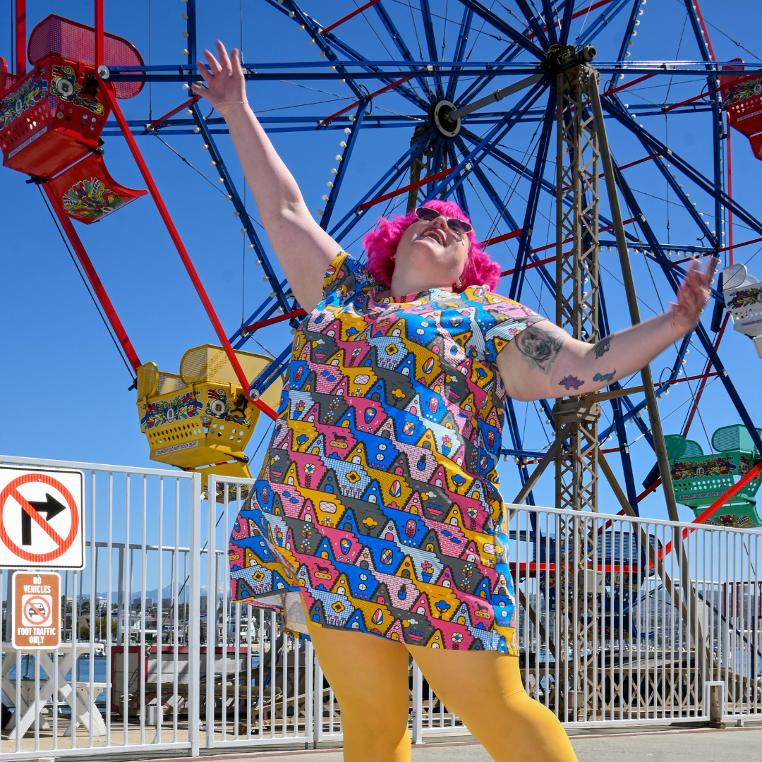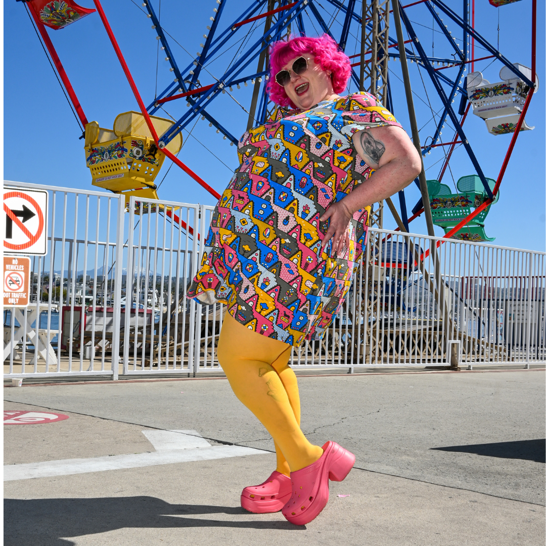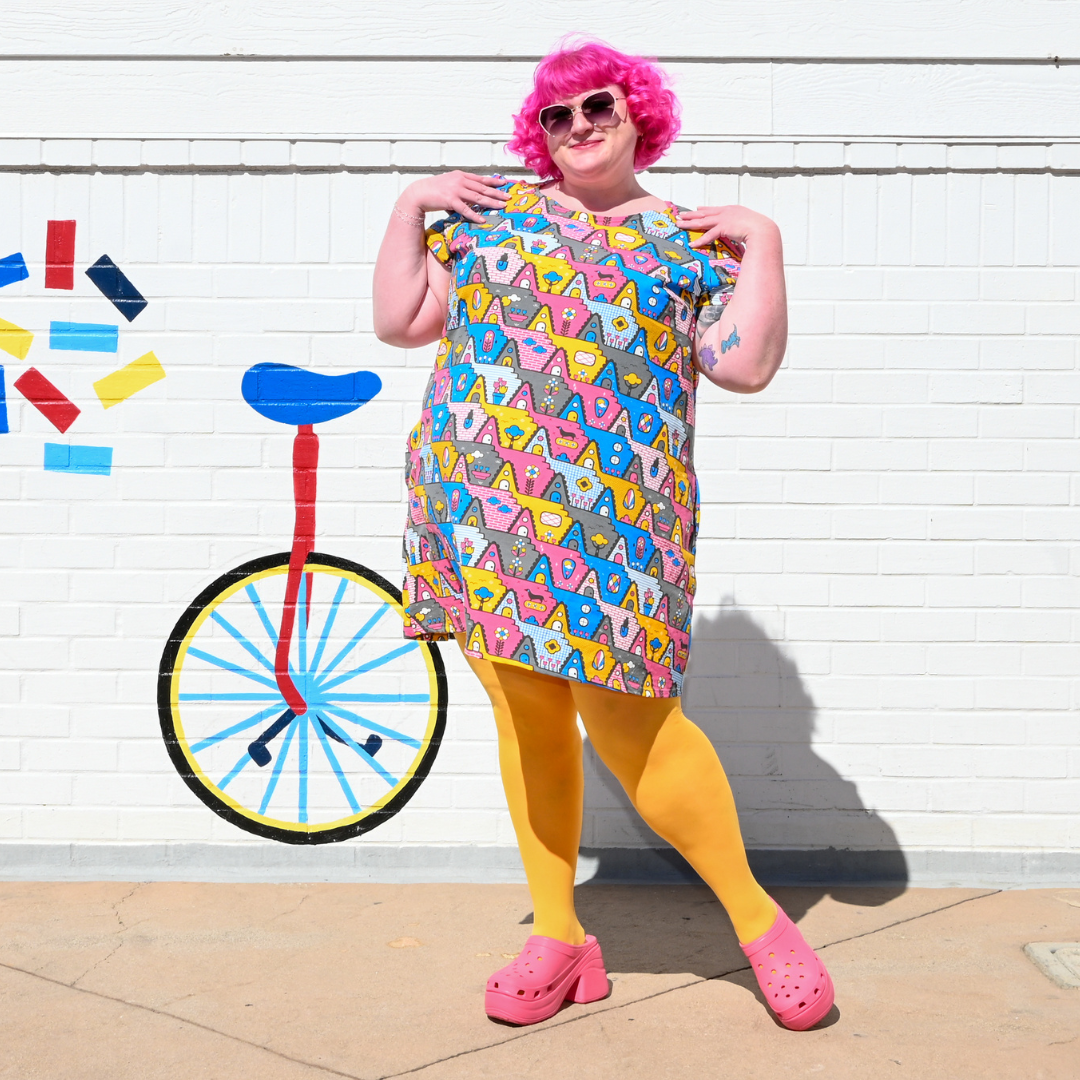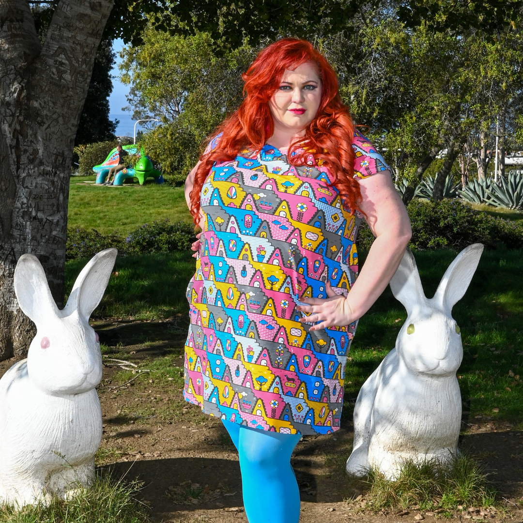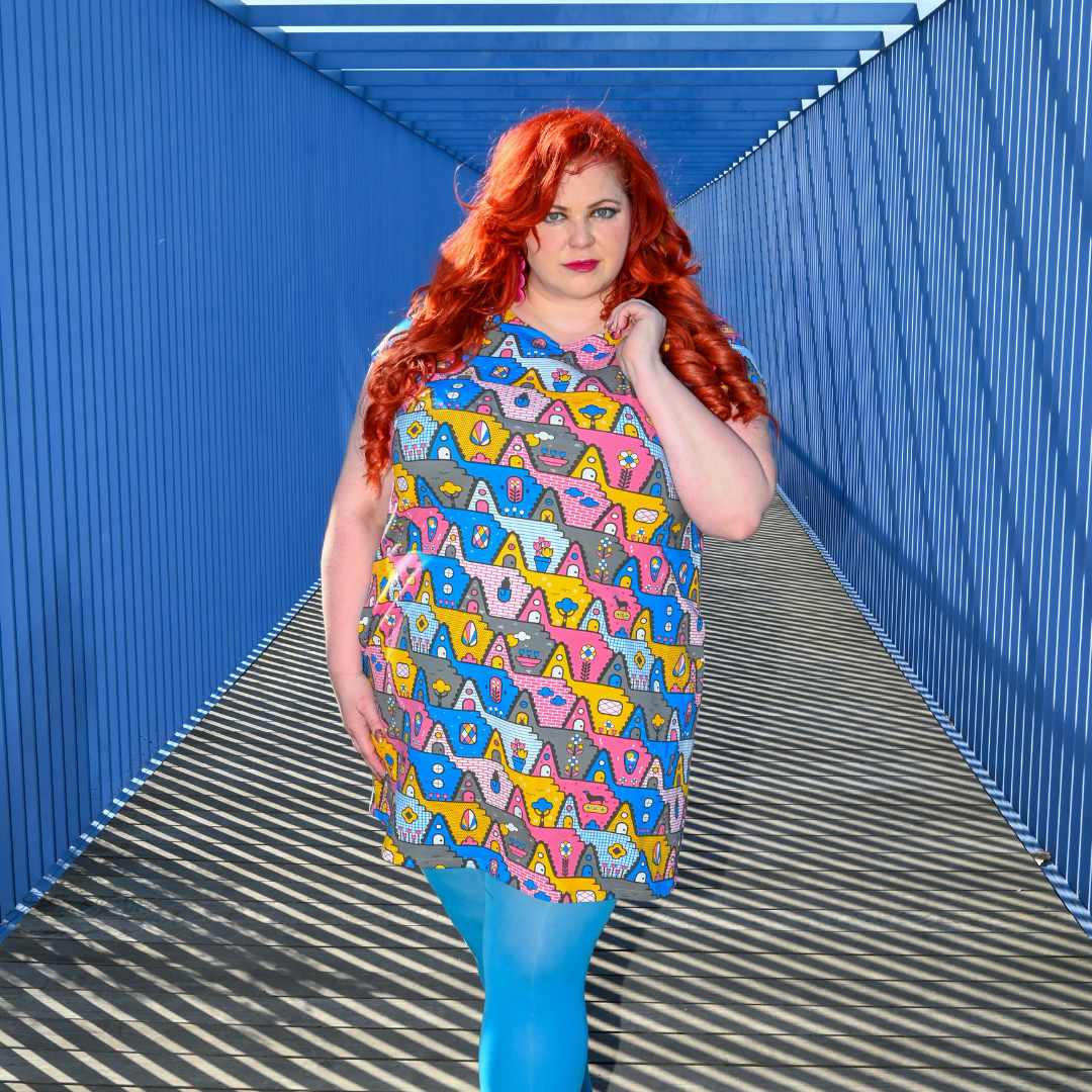 We are excited to introduce our fun a-frame house print inspired by 1980s culture adorning our a-line pocket tunic in gold green, orange, yellow and fuchsia. We promise you'll love the precious little pets in this print. Please see measurements below. Fits true to size.