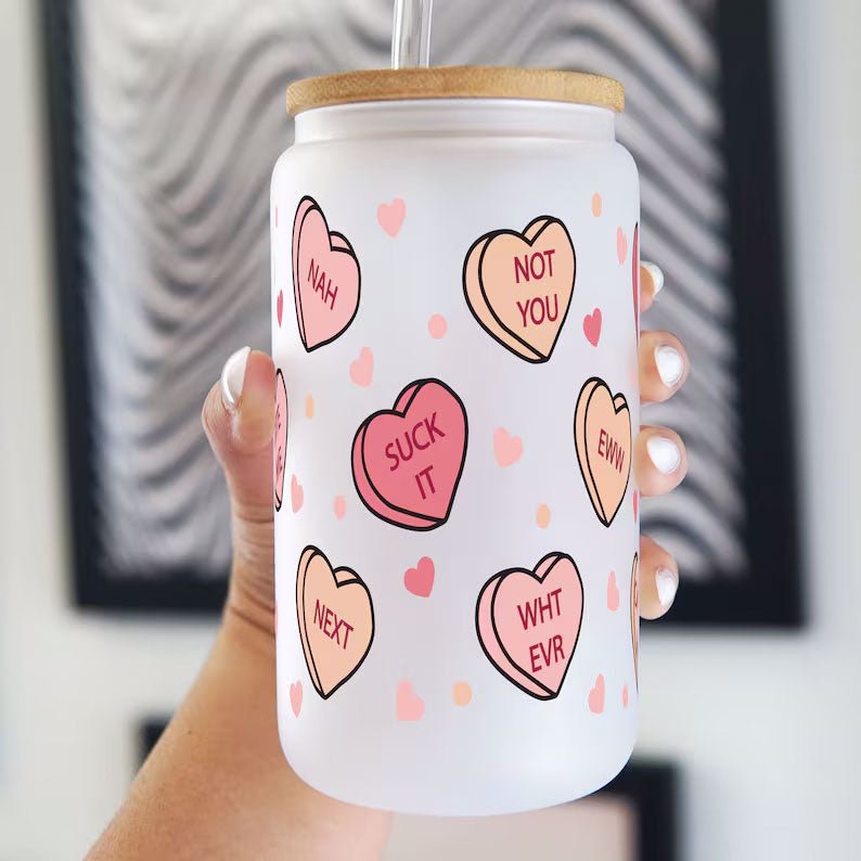 Check out our adorable Anti-Valentine glass can cup! It’s the perfect little treat for anyone who wants to ditch the typical lovey-dovey vibes this holiday. Cutely decorated with colorful candy hearts and cheeky messages, this cup adds a playful and rebellious twist to every sip. You can snag it in clear, frosted, or pink glass, and it comes in all sizes: 40oz, 20oz, 16oz, and even 17oz mugs! It’s perfect for any occasion, and trust me, it’s something they’ll absolutely love using every day!