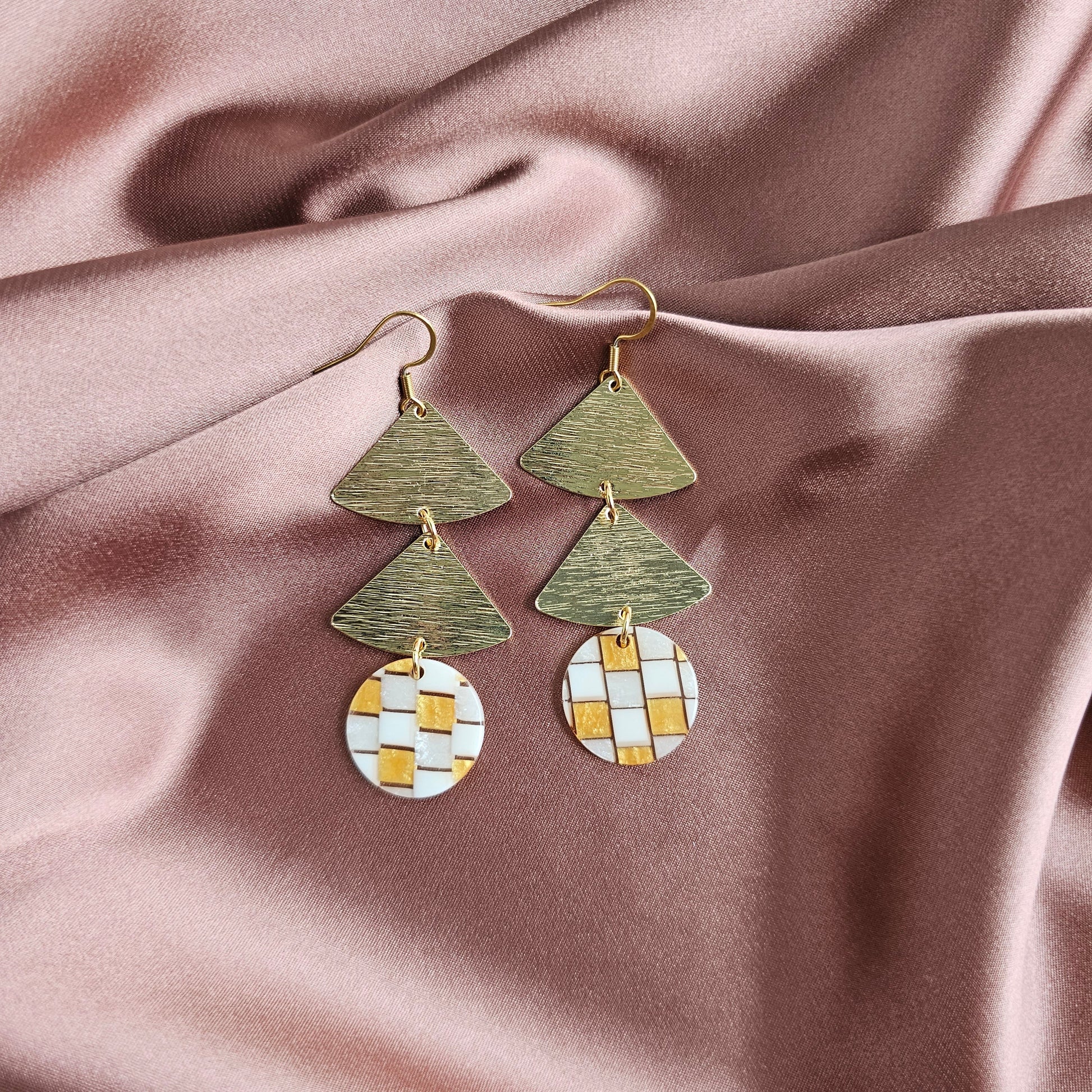 Let your ears do the talking with Anya! These glamourous golden checker statement earrings are sure to get heads turning and double the glam with their gold triangle charms. Be bold and beautiful with Anya - the perfect statement accessory!
