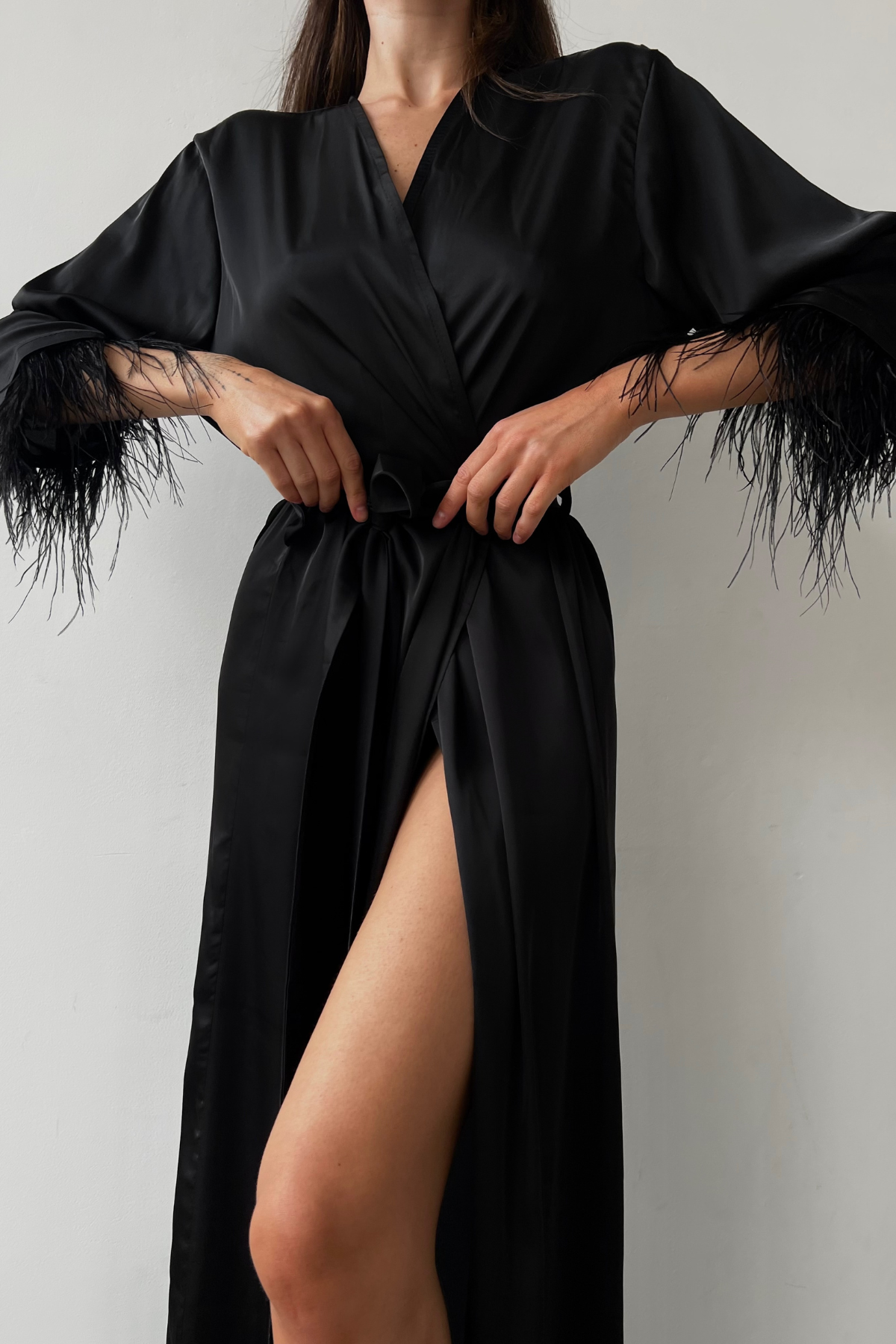 Look absolutely stunning in this new arrival! Our black kimono robe is versatile with an optional detachable luxurious flouncy feather sleeve for times when you want to make a statement! Can be worn open or features an adjustable tie waist to accentuate your curves.