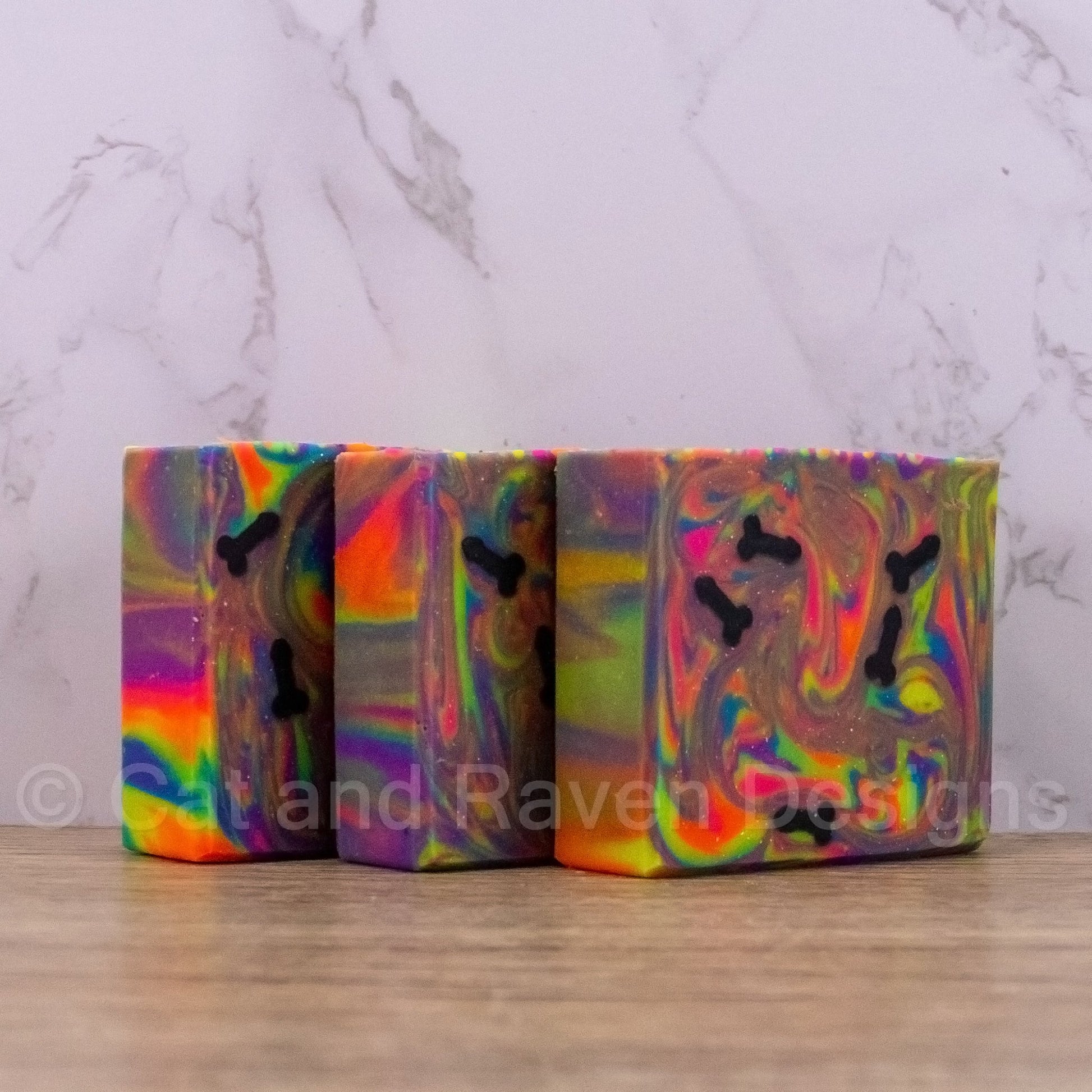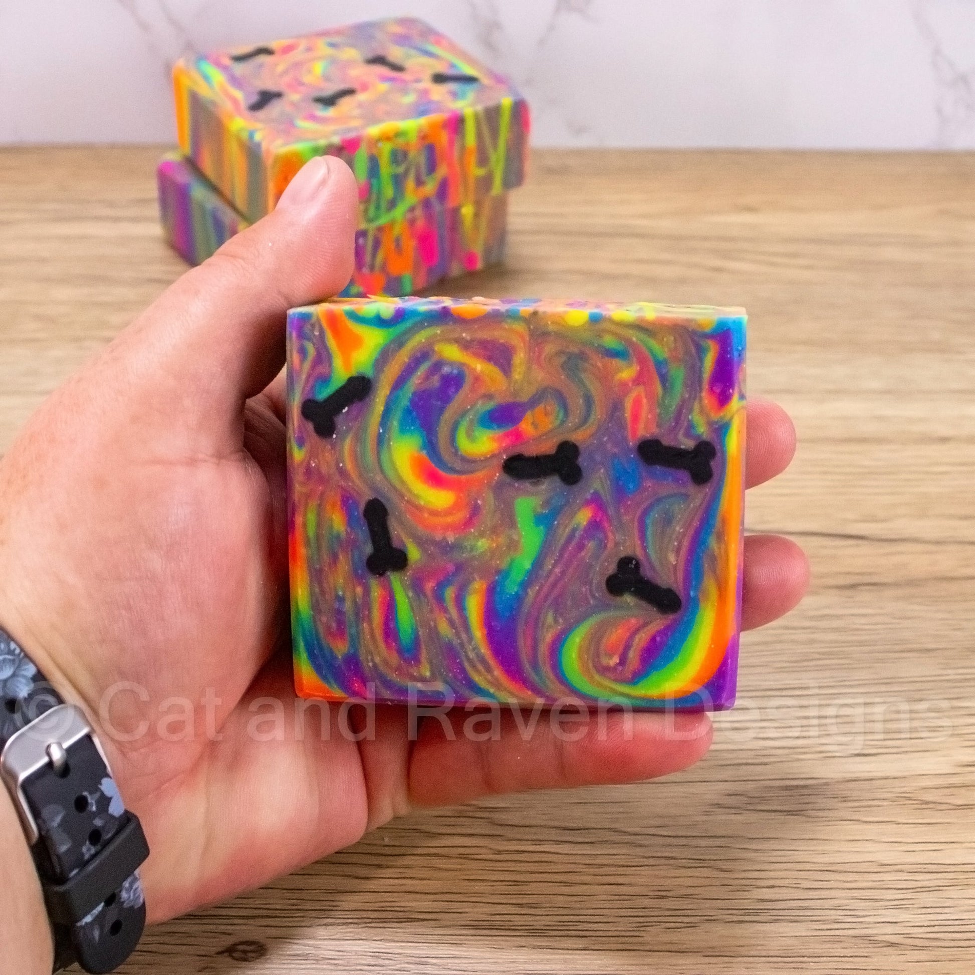 Ingredients: olive oil, rice bran oil, coconut oil, palm oil (RSPO), sodium hydroxide, almond oil, castor oil, shea butter, cocoa butter, cornstarch, sodium lactate, fragrance, micas, and biodegradable glitter.