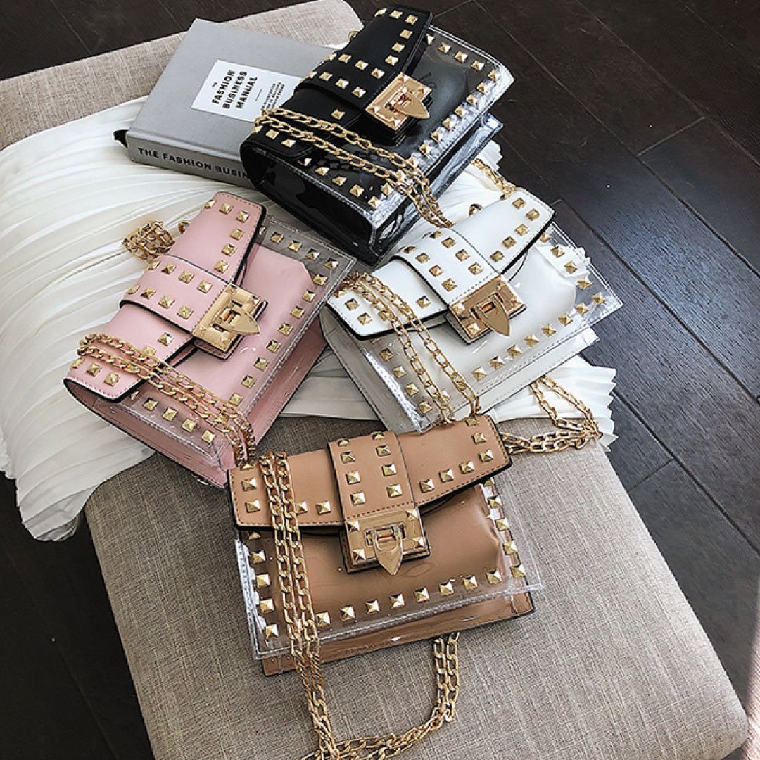 Gold studs delineate this fun, semi see-through bag. Clear on the front but comes with a removable pouch, in the same color of the bag, roomy enough to fit your essentials.