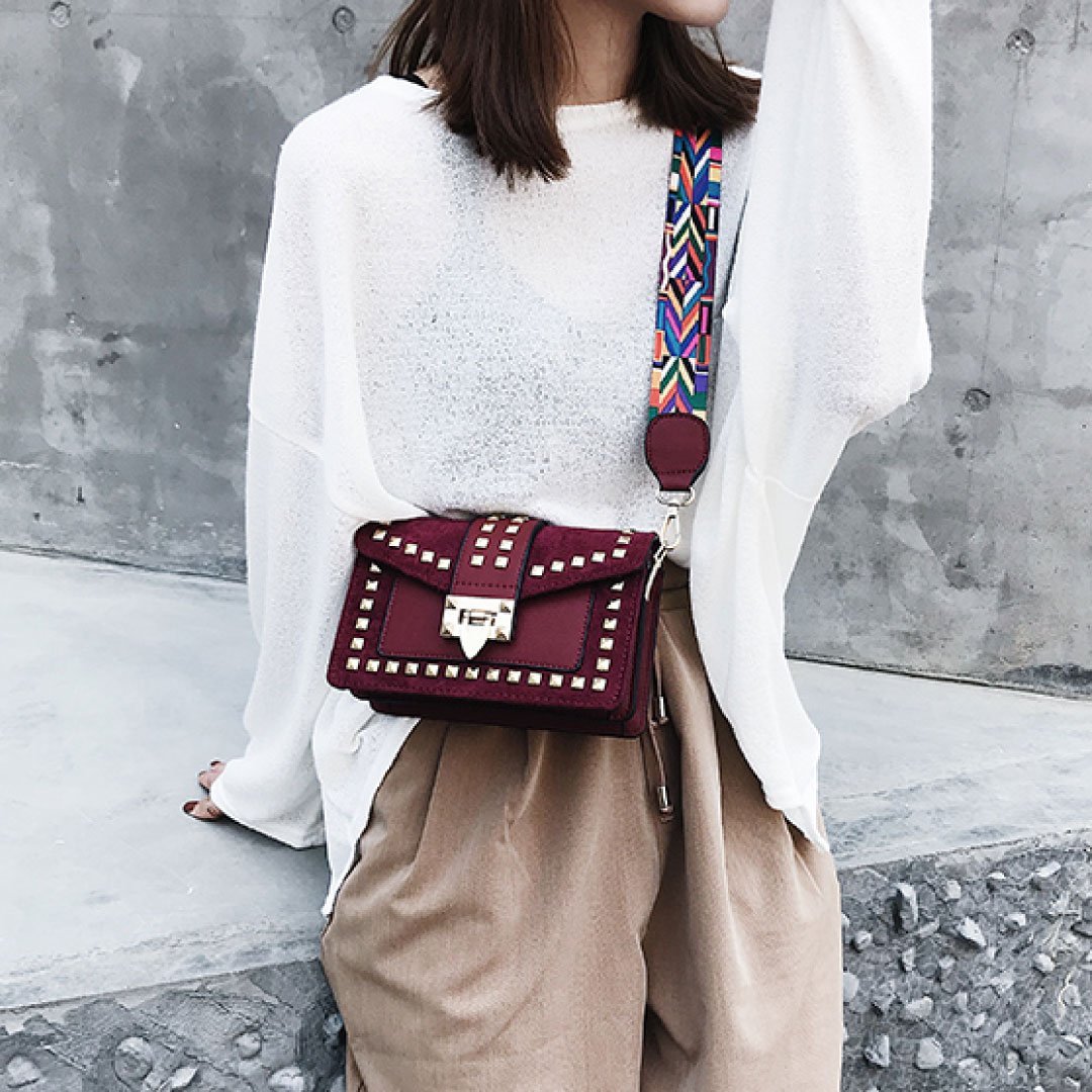 Soft, velvet texture and a removable colorful strap that can be worn as a shoulder bag or a crossbody. Gold studs delineate this fun bag.