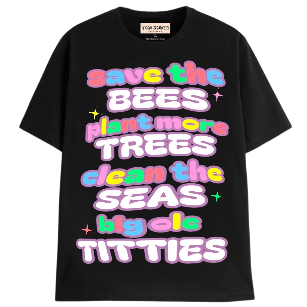 Save the bees, plant more trees, clean the seas, big ole titties Funny Graphic tees are the best!