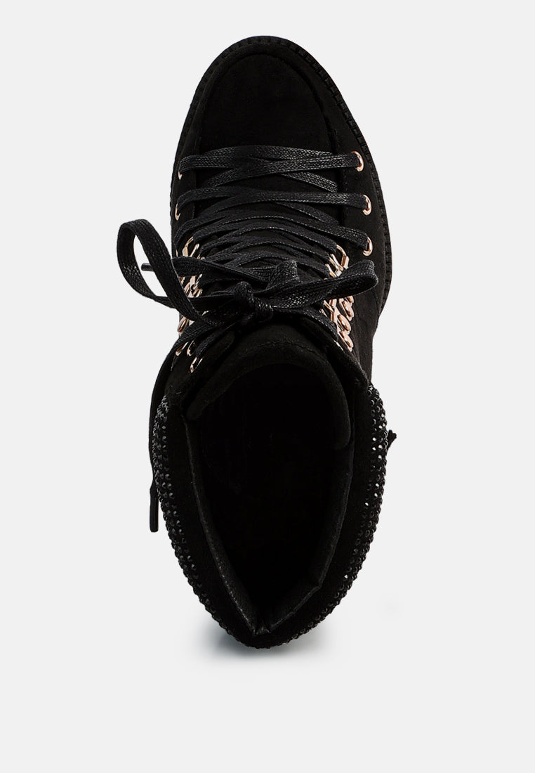 Birch Block Heeled Ankle Boots are rhinestone boots with cushion collar. These high heeled boots come with a back buckle, a sturdy lug sole, and metal eyelet detailing. You can't go wrong with this pair of ankle boots for any of your outfits. The lace up closure adds esthetic to the shoe. These girls boots for sure will make heads turn to make you the quintessential diva you are.
