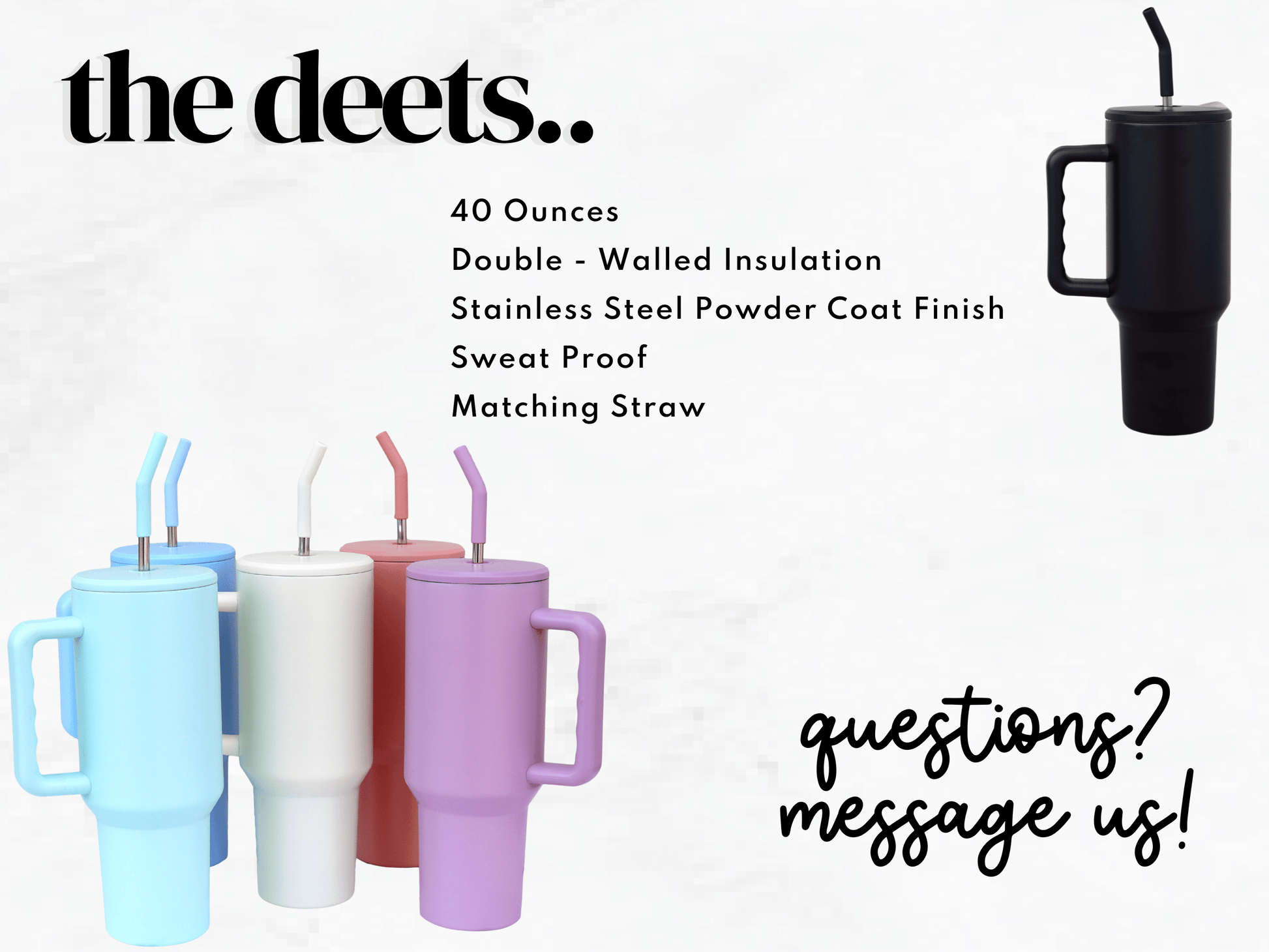 Our tumblers are double wall insulated, they are stainless steel and have a powder coated finish! They are sweat proof and if that's not enough they have the matching colored straw!