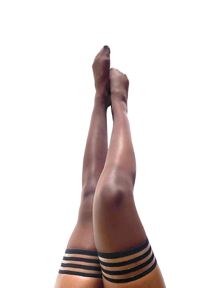 Our Chocolate sheer thigh-highs are the perfect complement to a darker skin tone on your Big Day! Modern but classic, with a band that keeps them up all day! Our thigh-highs are designed for all-day wear, with a no-slip-grip. We offer Petite to Plus Size Stockings and are the #1 thigh-highs that actually stay up!