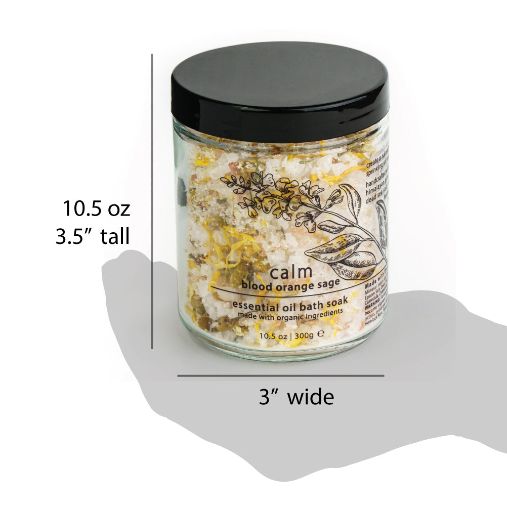 - Each essential oil bath soak is packaged in a beautiful 10.5 oz. glass jar. Paraben-free, sulfate-free, and cruelty-free quality guarantee you'll love the soothing mineral salts and fresh aroma.