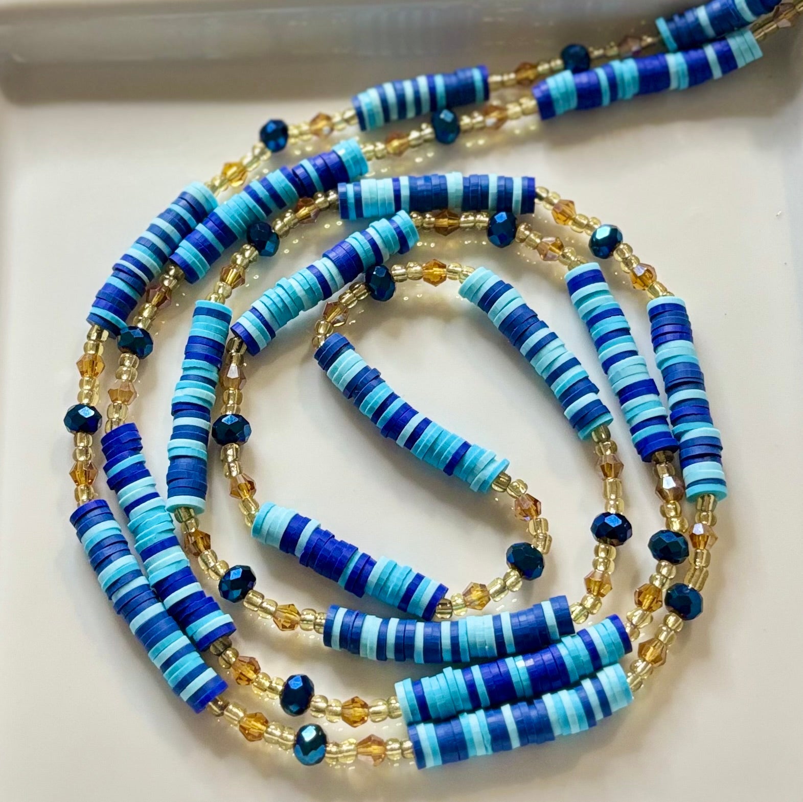 A stunning interplay of dark and light blue clay beads, accented with radiant gold details, this waistbead set embodies the essence of serenity, intuition, and divine wisdom. The deep blue hues evoke depth, strength, and stability, while the lighter blues bring a sense of calm, clarity, and fluidity—like the rhythmic dance of ocean waves. The gold accents add an elegant touch of prosperity, warmth, and celestial energy, making this set a powerful adornment for those who seek balance, grace, and empowerment.