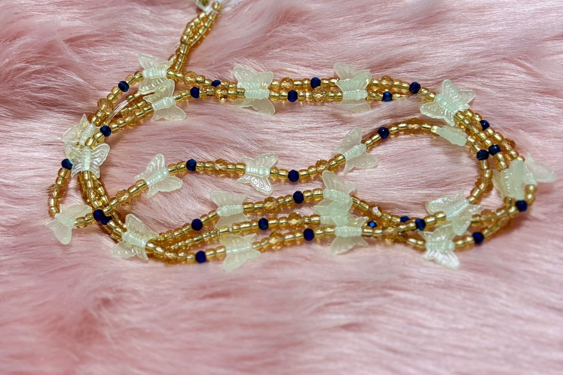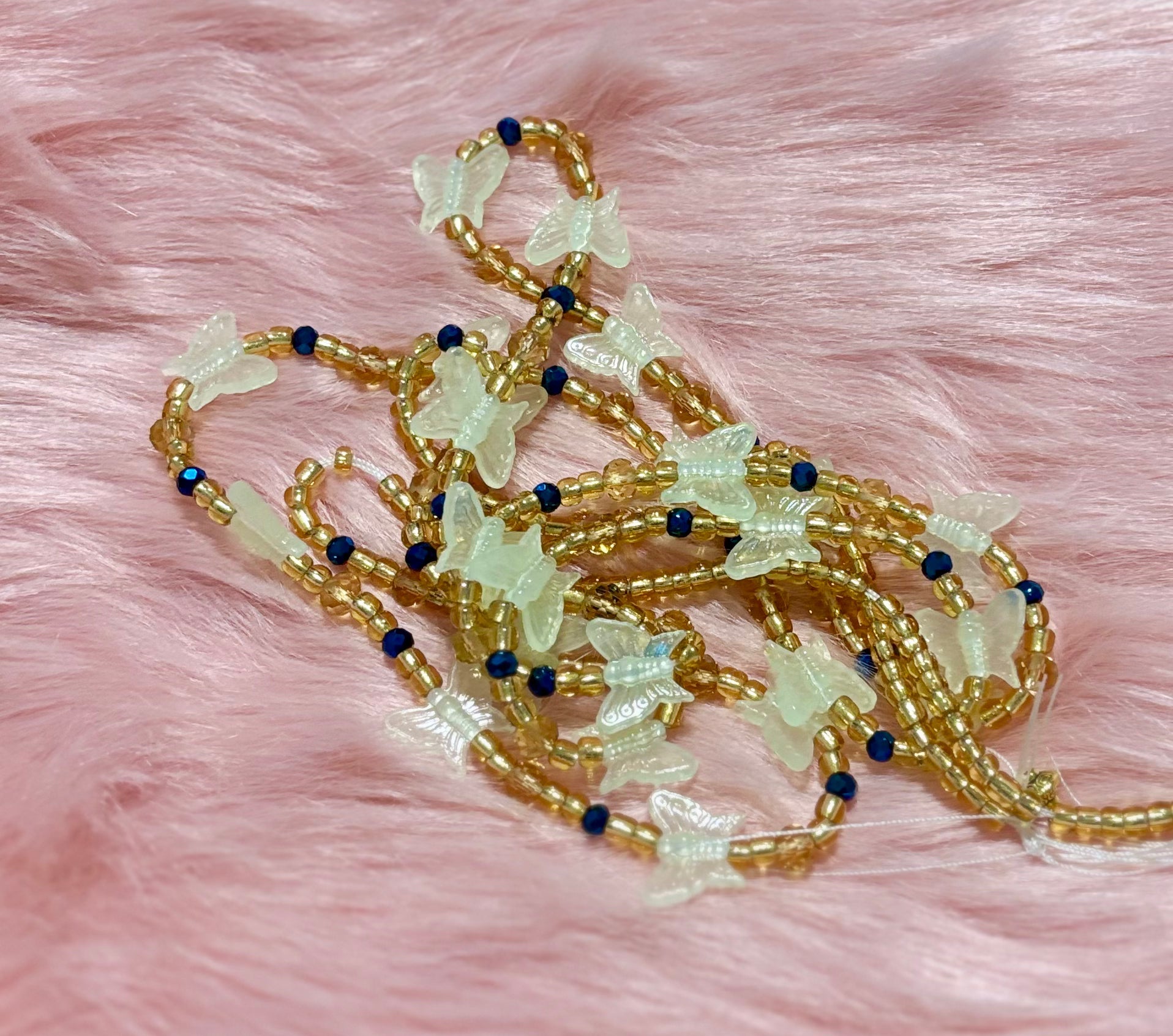 Let your inner light glow in the dark. This mesmerizing waistbead set features deep midnight blue and soft champagne gold beads, paired with delicate glow-in-the-dark butterflies that shimmer like fireflies after dusk.