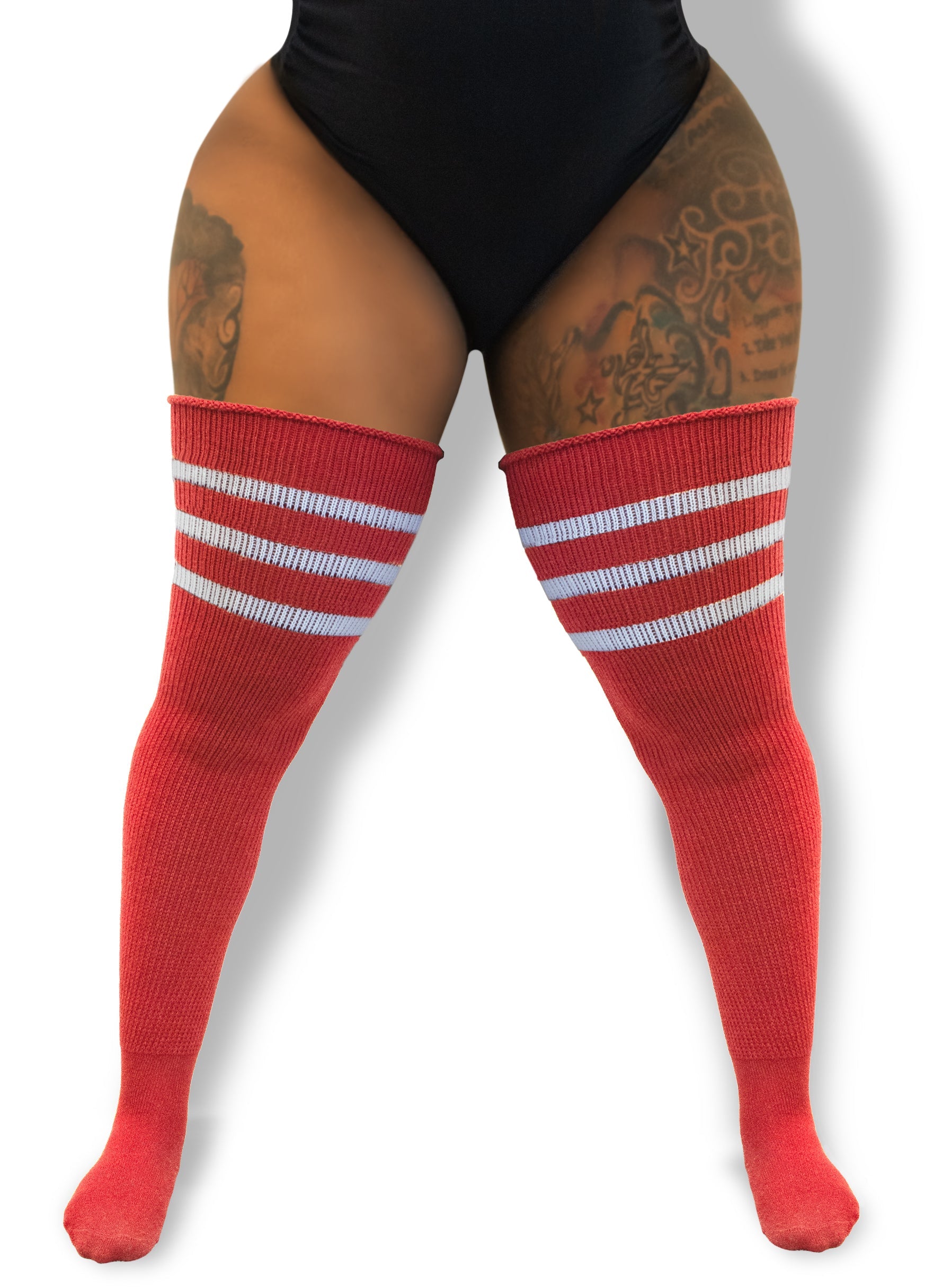 Embrace a burst of vibrant confidence with our Cherry Bliss Striped Thigh-Highs. Crafted for those who love to stand out, these socks feature a luscious cherry red base, accented with playful white stripes at the top, embodying a blend of boldness and classic charm. Designed specifically for the plus-size goddess, they promise not only a snug and flattering fit but also a statement of style that refuses to be ignored.