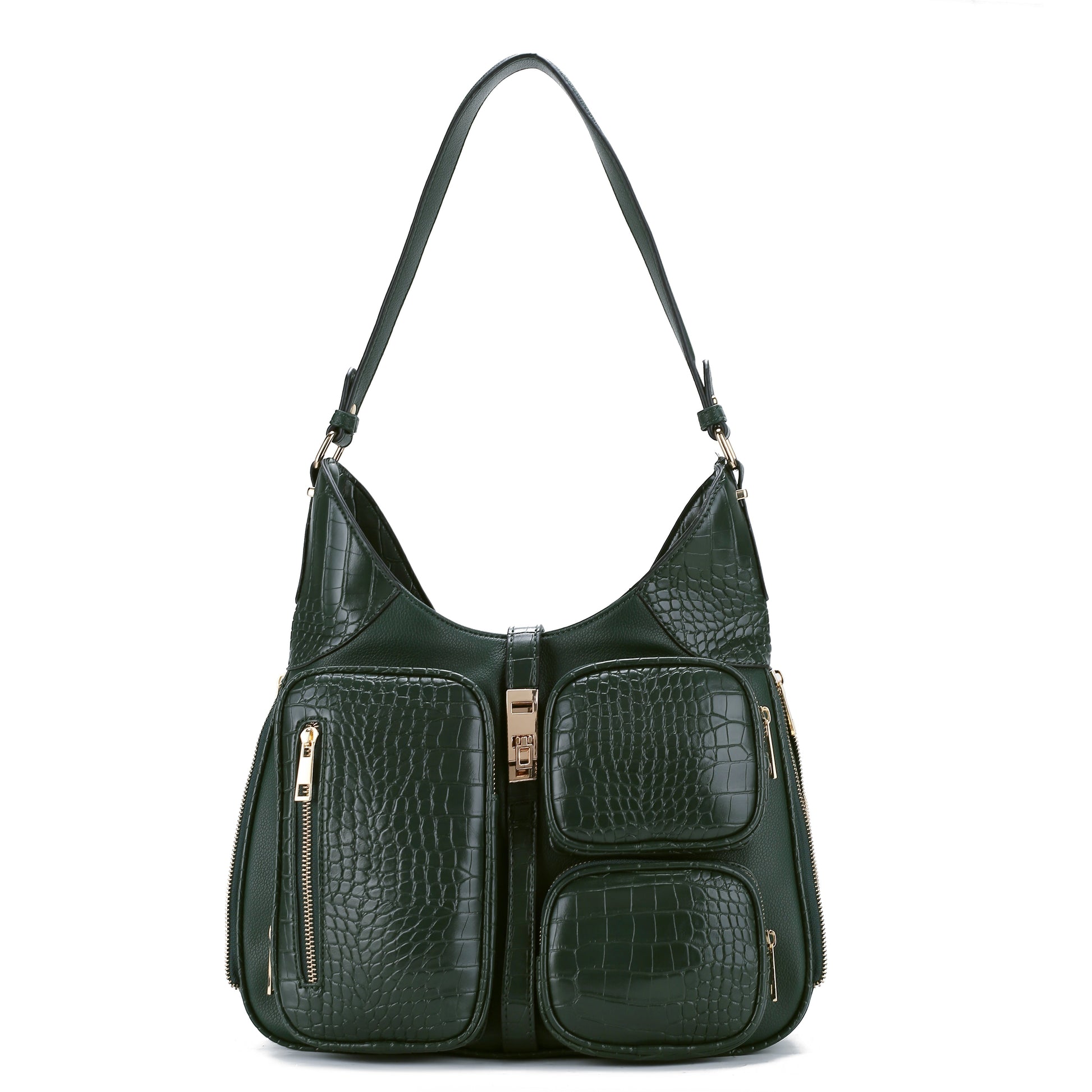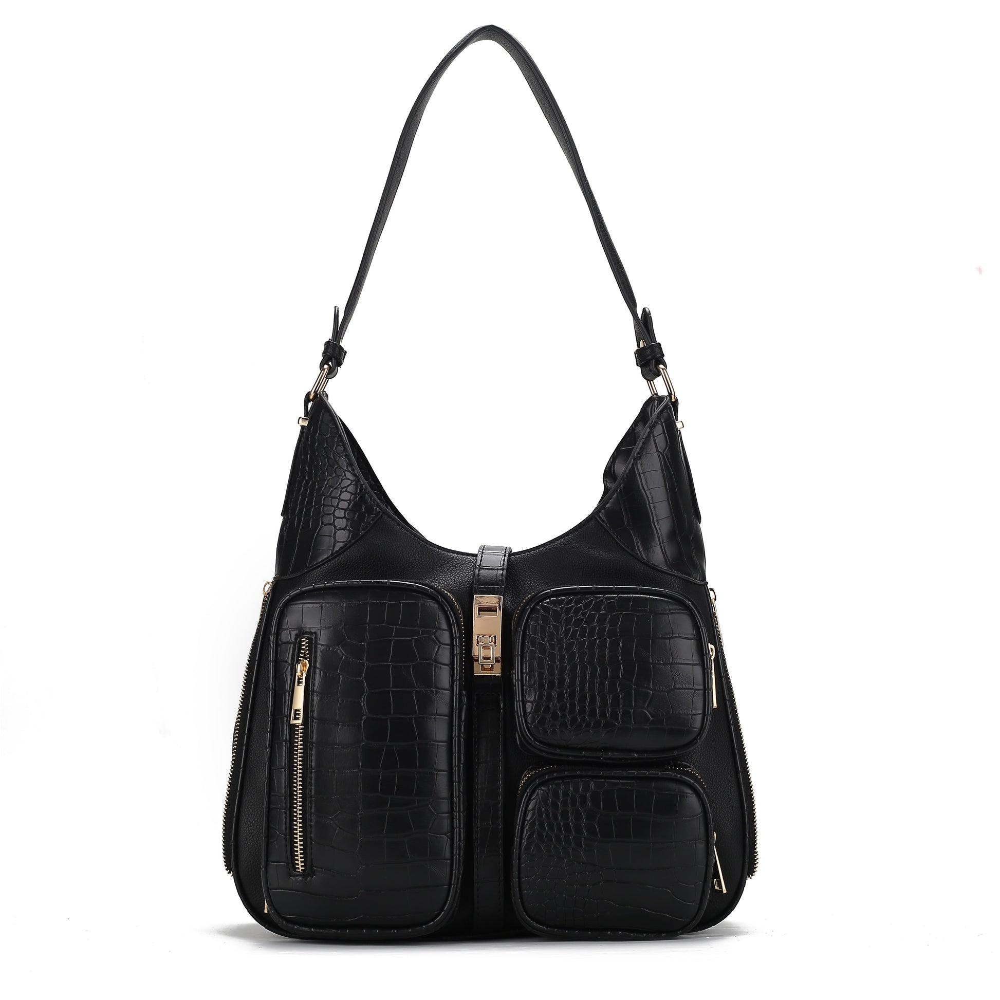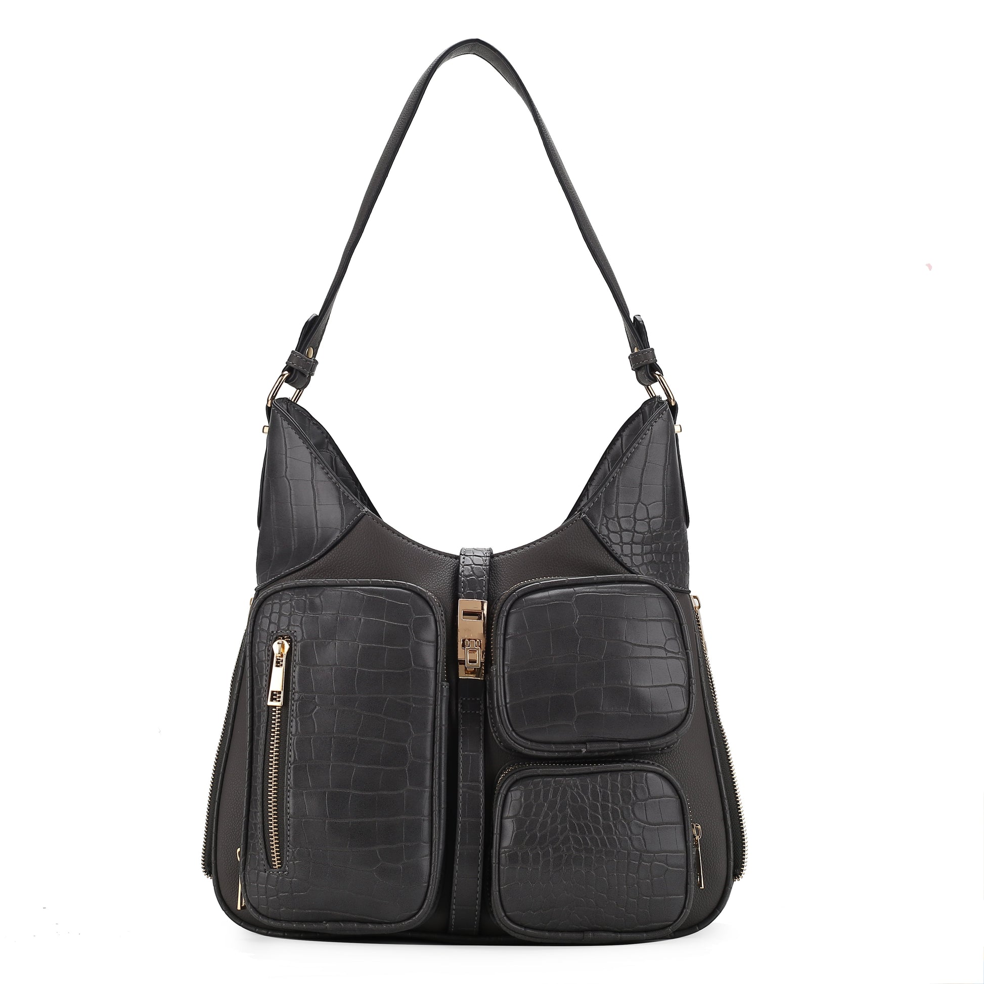 - Exterior details: three front zippered pockets and one back zippered pocket.