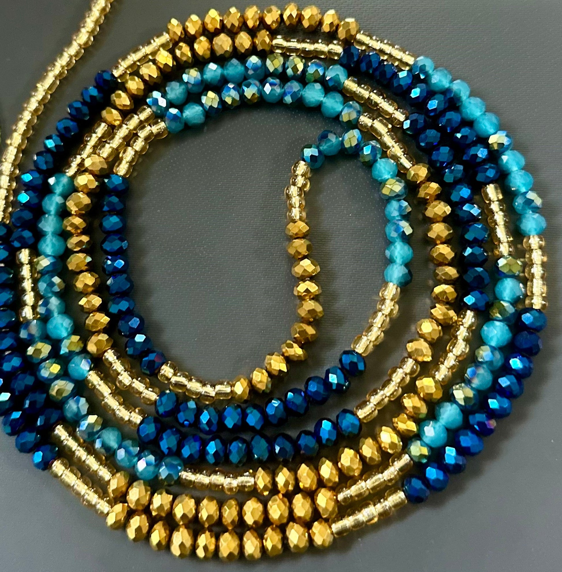 These waistbeads are a captivating fusion of tranquil blues and radiant gold, designed to bring a sense of elegance and serenity to your style. The shades of blue range from soft aquas to deeper navy hues, evoking a sense of calm and depth, while the gold beads add a luxurious touch of warmth and sparkle. Strung with care, these beads create a harmonious blend that is both soothing and eye-catching. Whether worn as a subtle accent or a statement piece, these waistbeads exude sophistication and timeless beauty, making them the perfect accessory for any occasion.