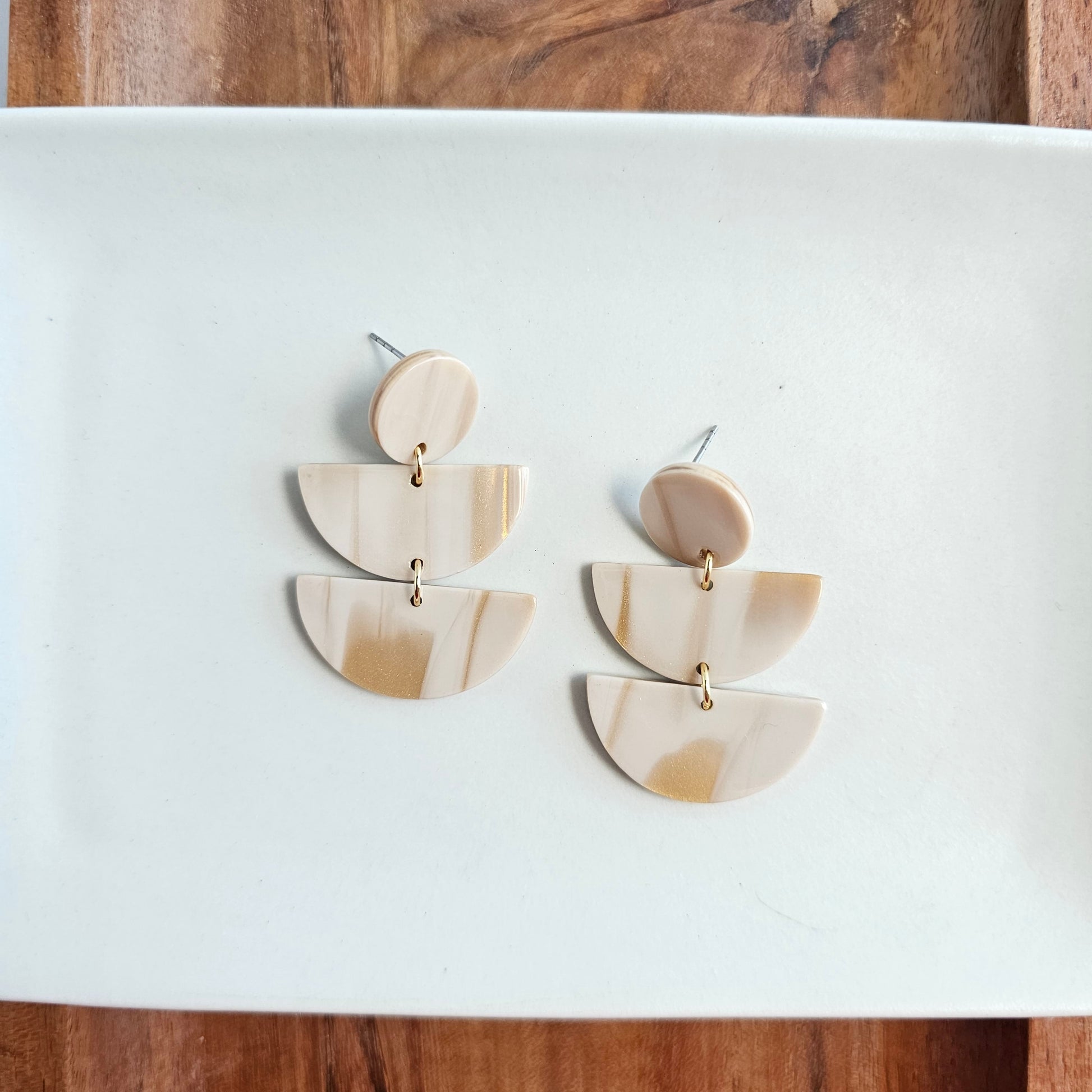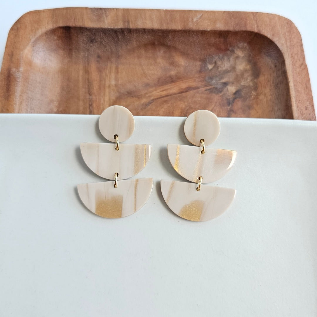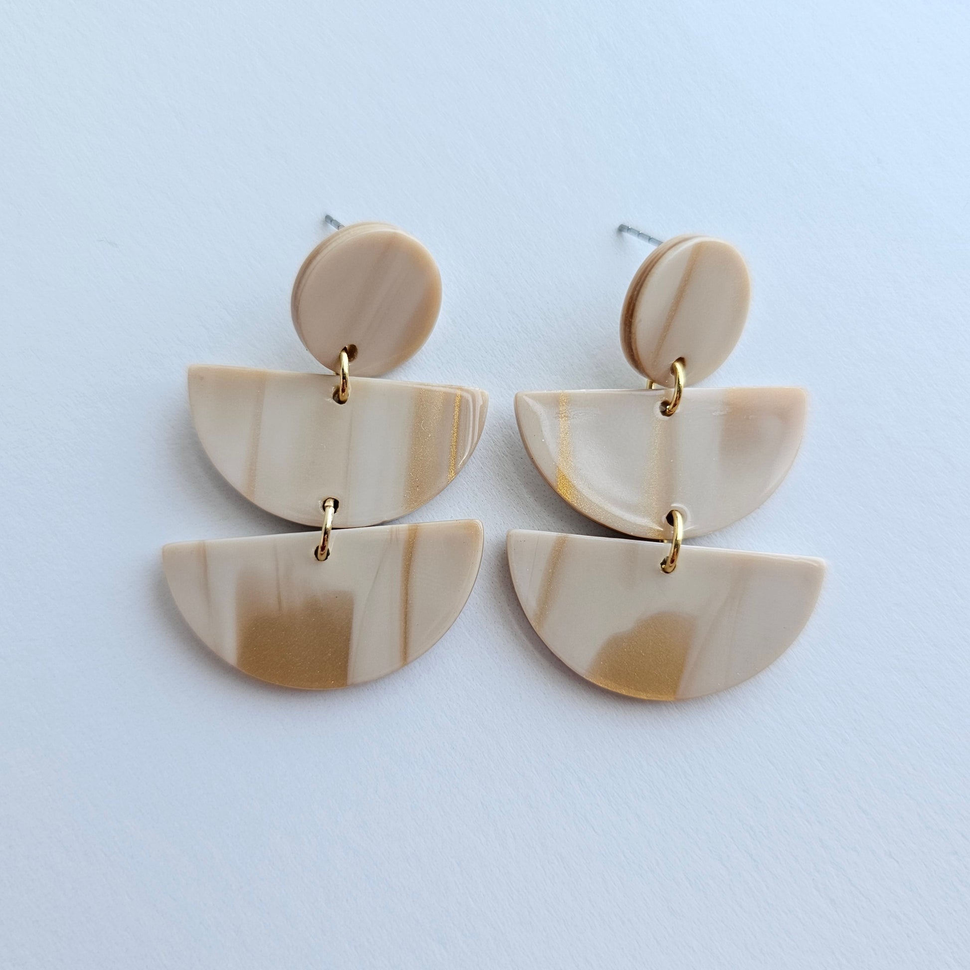 Introducing Elsie – a chic and sassy addition to any ensemble! These golden ivory acrylic earrings make a bold statement with their monochromatic design and semi-circle drops. Look stylish and on-trend with a pair of these beauties.