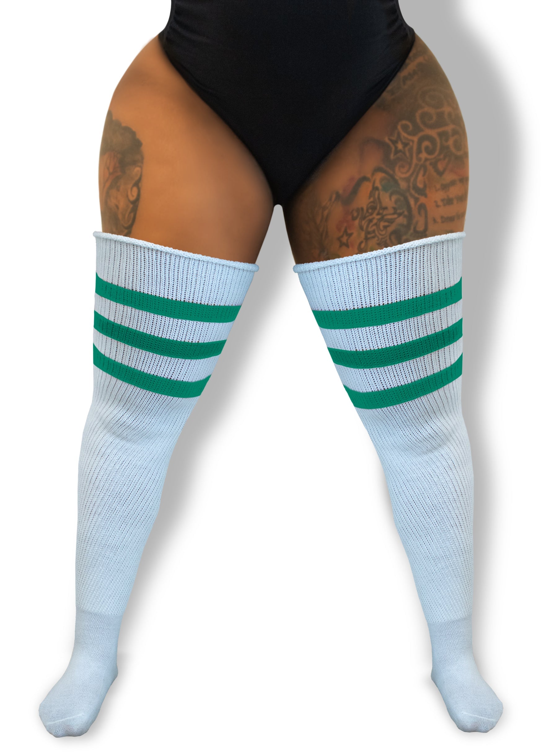 Discover the charm of our "Evergreen Stride Plus Size Thigh-Highs," where the timeless elegance of white meets the vibrant spirit of green stripes. These socks aren't just an accessory; they're a declaration of style, comfort, and a little rebellion against the force that tries to bring us down – yes, we're looking at you, gravity.