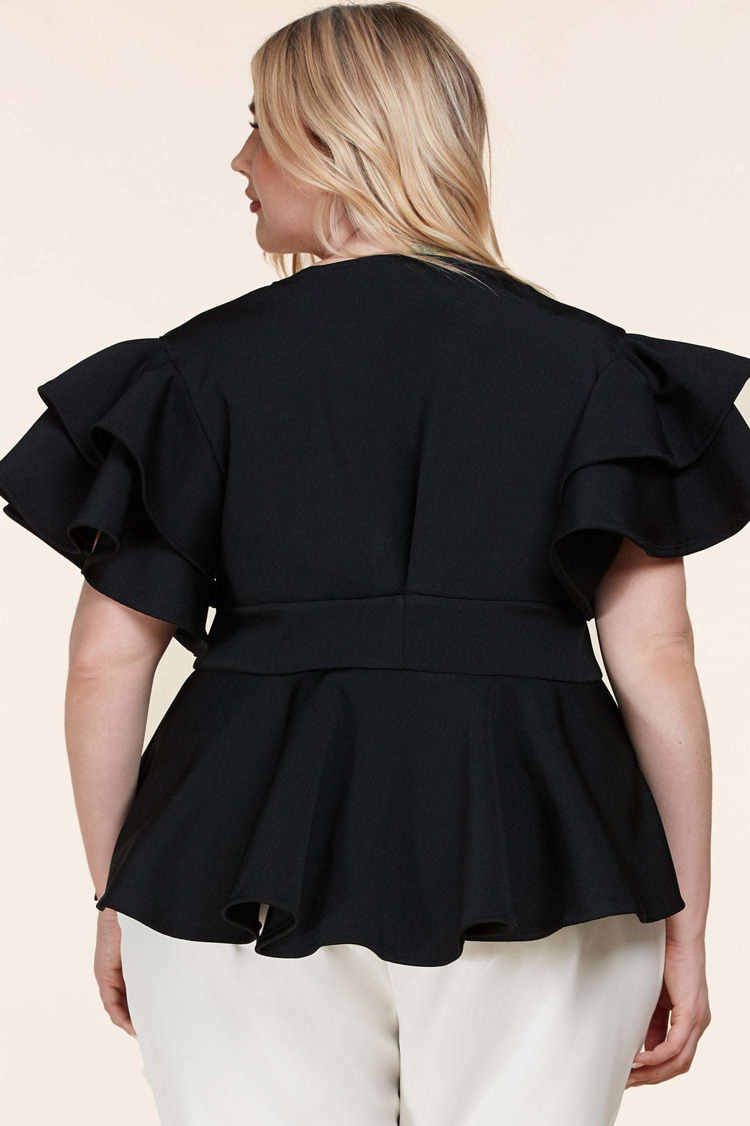 This sexy; fun Ruffle Top in Black features a plunging V-Neck and a Fit-and-Flare silhouette with a self-tie bow at the waistband which rests atop a flared, ruffled hem. Tiered Ruffle Cap Sleeves; pleats at the chest give the top even more shape.