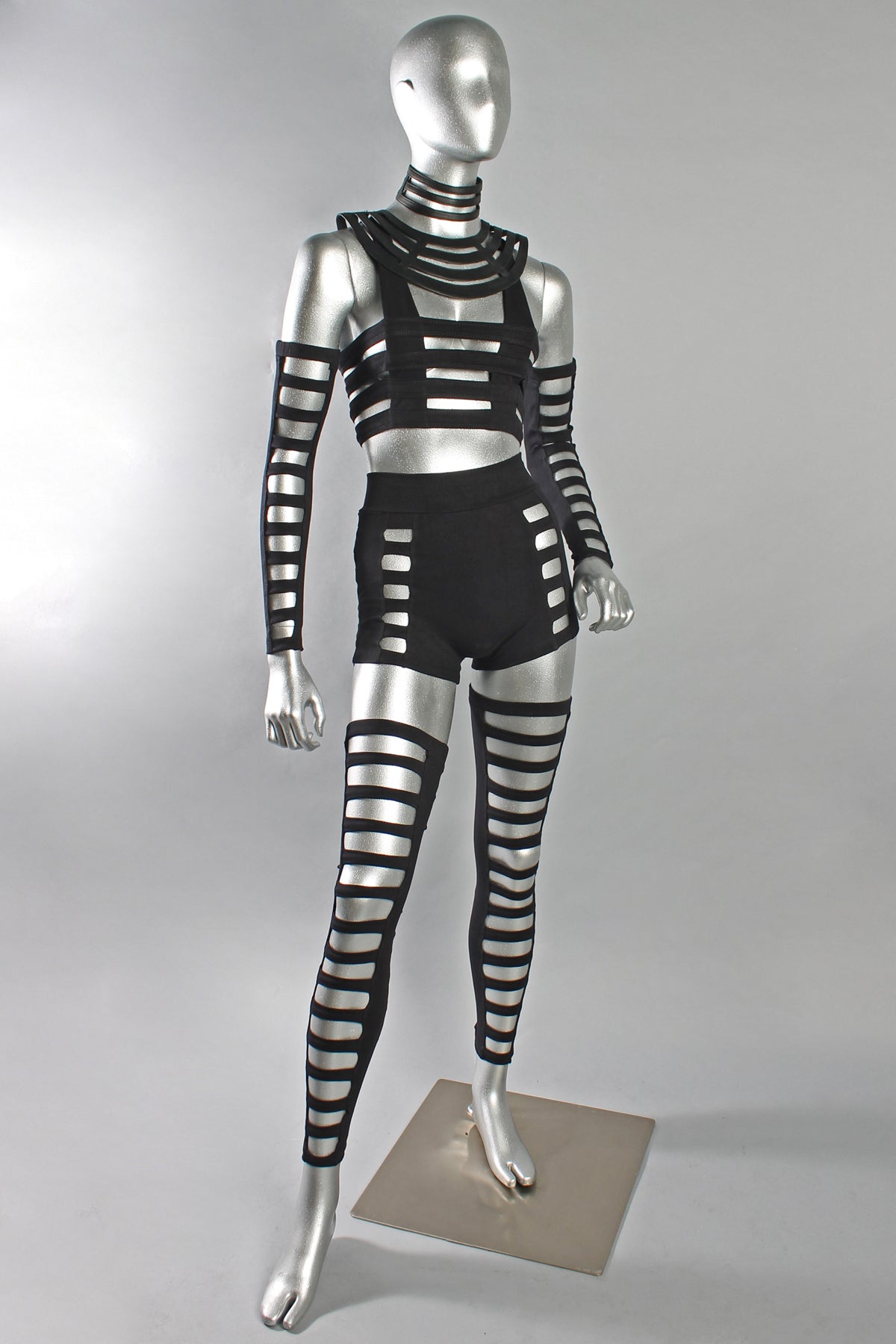 This cage bra is surprisingly strong and offers ample coverage on all cup sizes! The thick cotton lycra is very supportive. Each strap on this piece has been hand placed and sewn, this is not cut. Wear it alone at a festival or pool party, or layer it with other items for a dramatic effect.