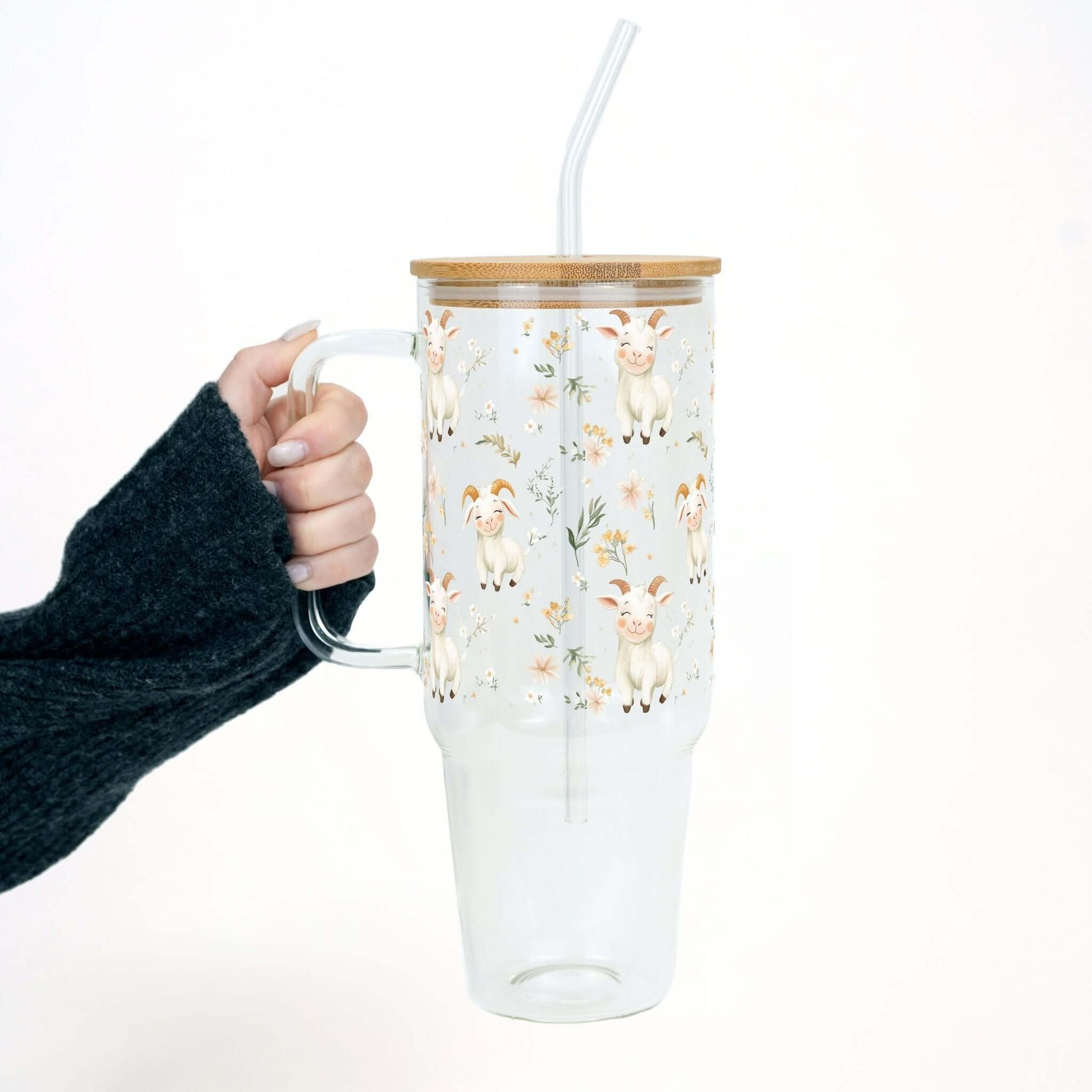 This one’s got major personality. With happy little goats and soft floral details, this tumbler is here to brighten your day (and hold your drink while it’s at it). Comes with a bamboo lid, comfy glass handle, and a straw to keep it cute and practical.