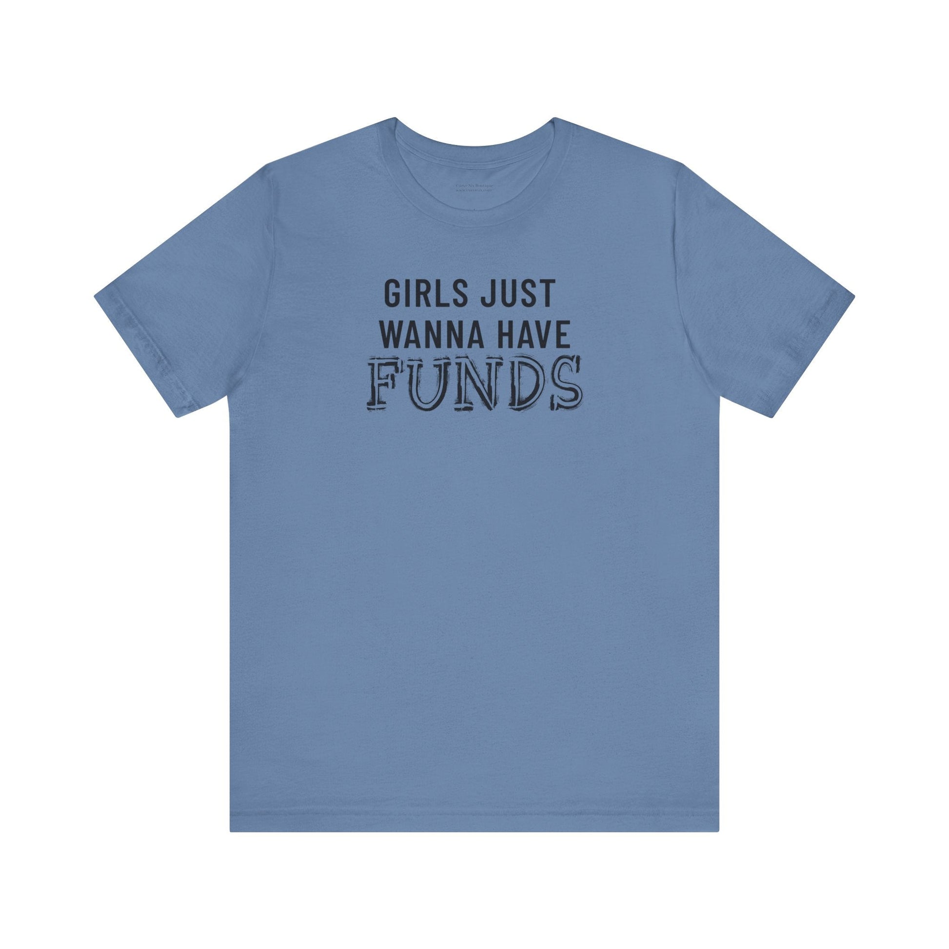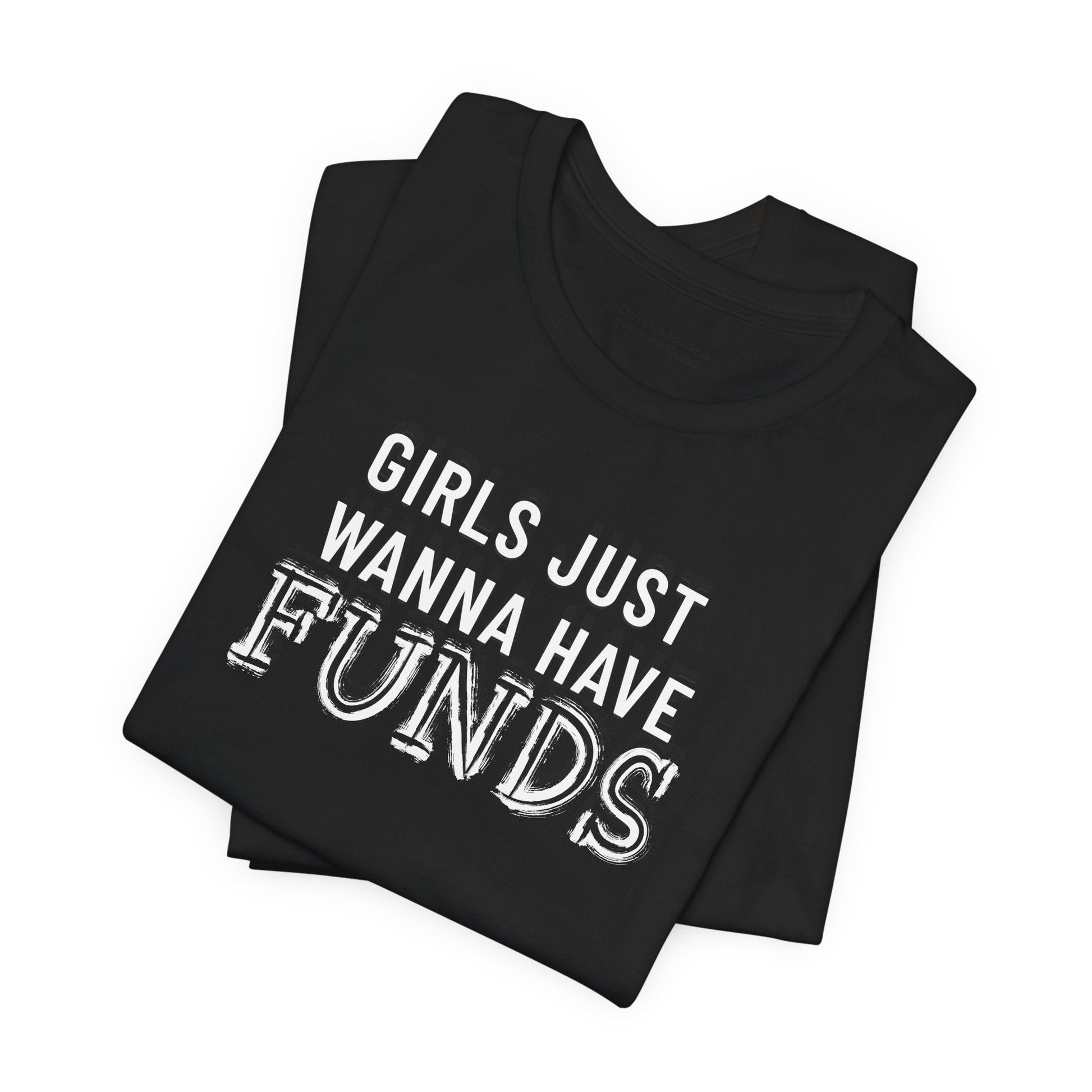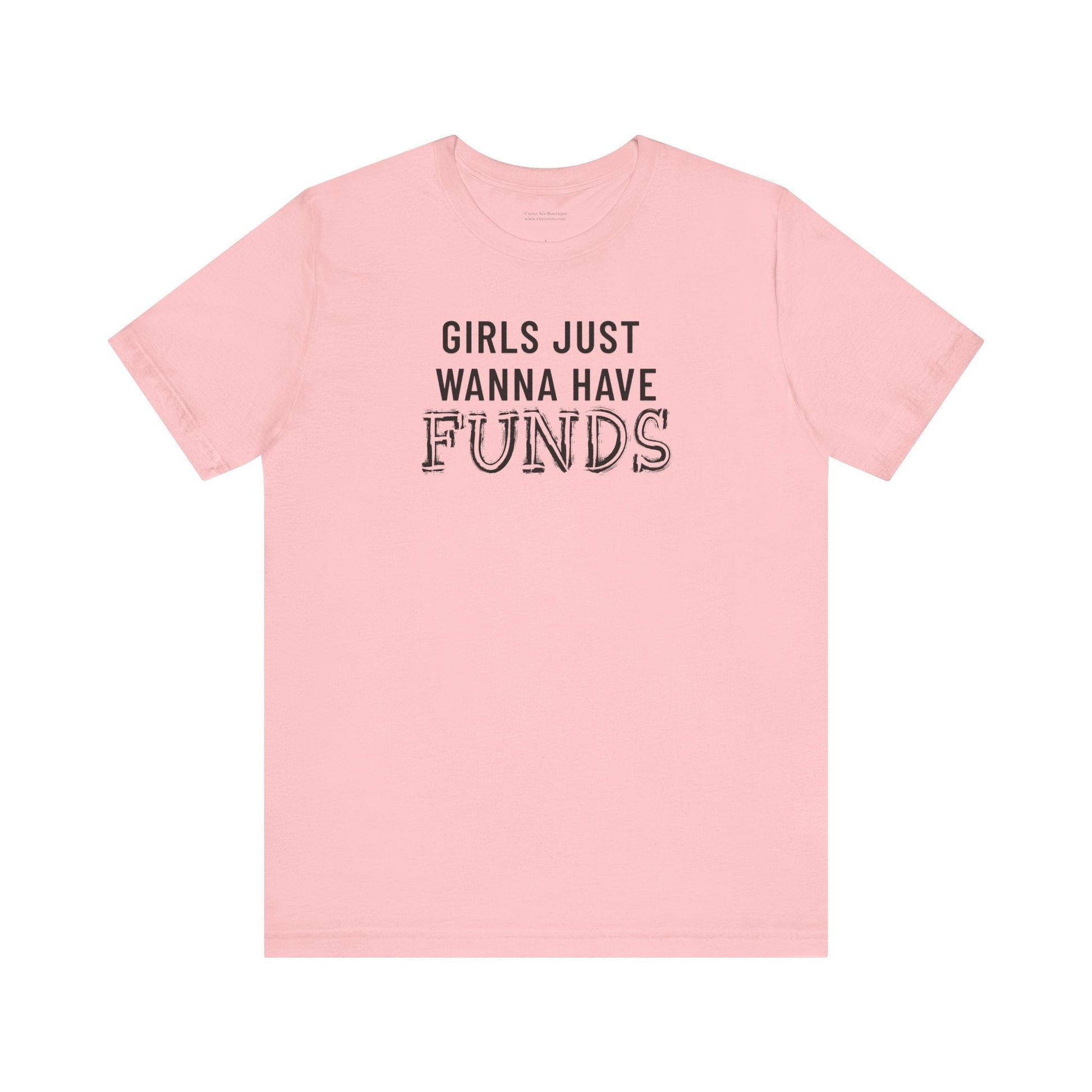 Graphic design tee with "Girls Just Wanna Have Funds". This classic unisex jersey short sleeve tee fits like a well-loved favorite. Soft cotton and quality print make users fall in love with it over and over again. These t-shirts have-ribbed knit collars to bolster shaping. The shoulders are tapered for a better fit over time. Dual side seams hold the garment's shape for longer.