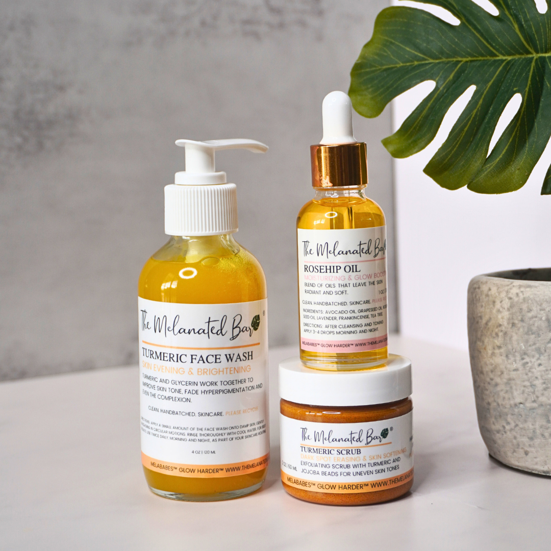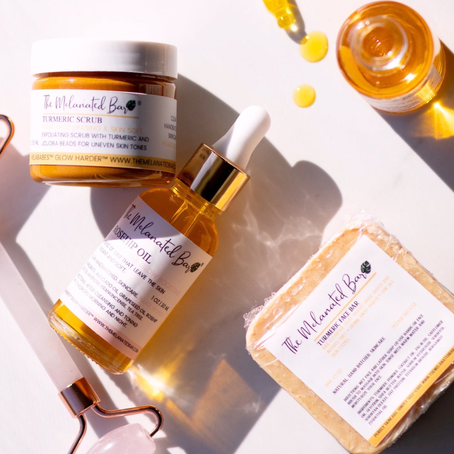 • Turmeric Face Bar (3.5 oz) or Turmeric Face Wash (4 oz) – Cleanses deeply while prepping your skin for the glow-up