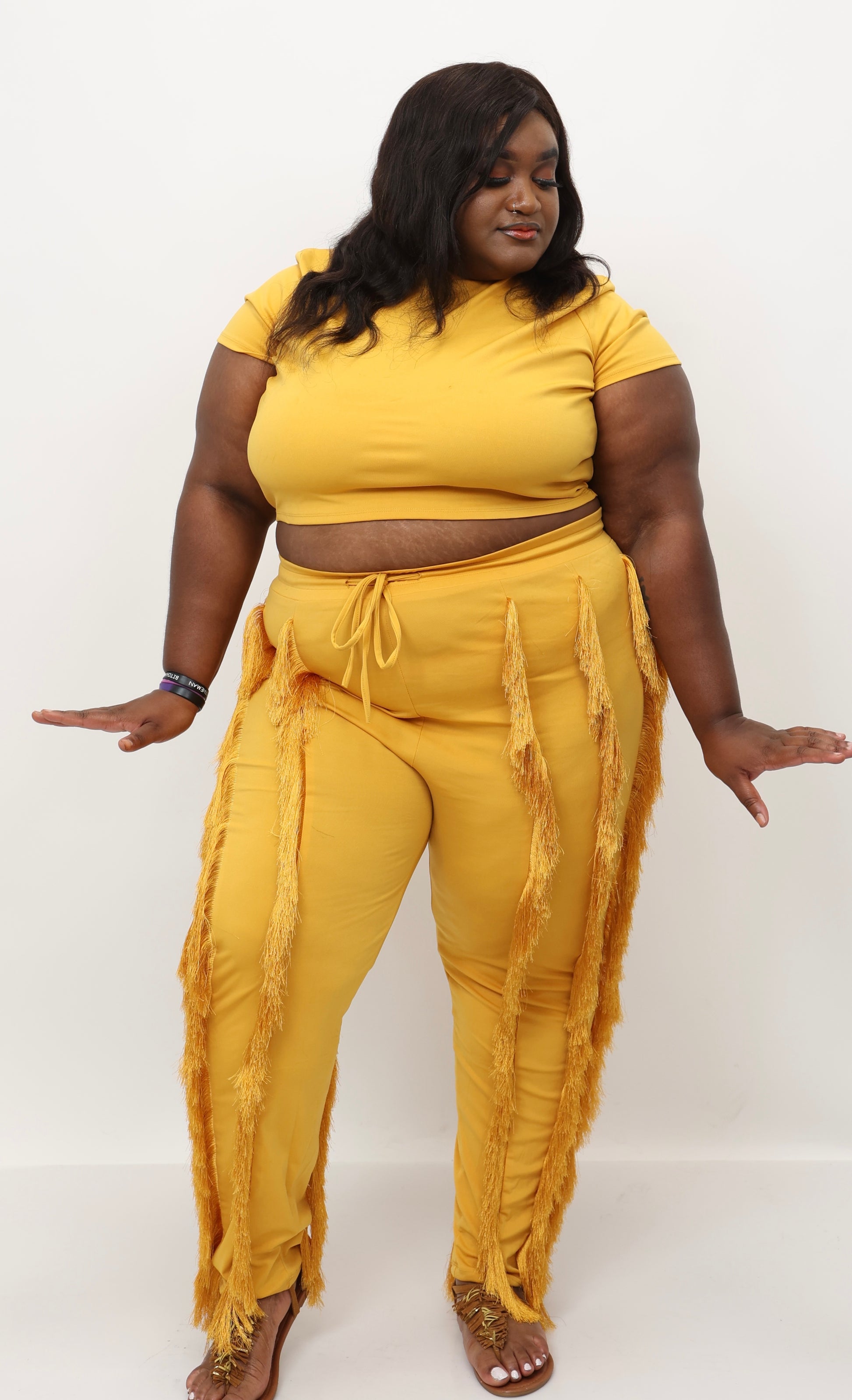 - Fit: Features a crop top with a round neck and short sleeves, paired with high-waisted pants.