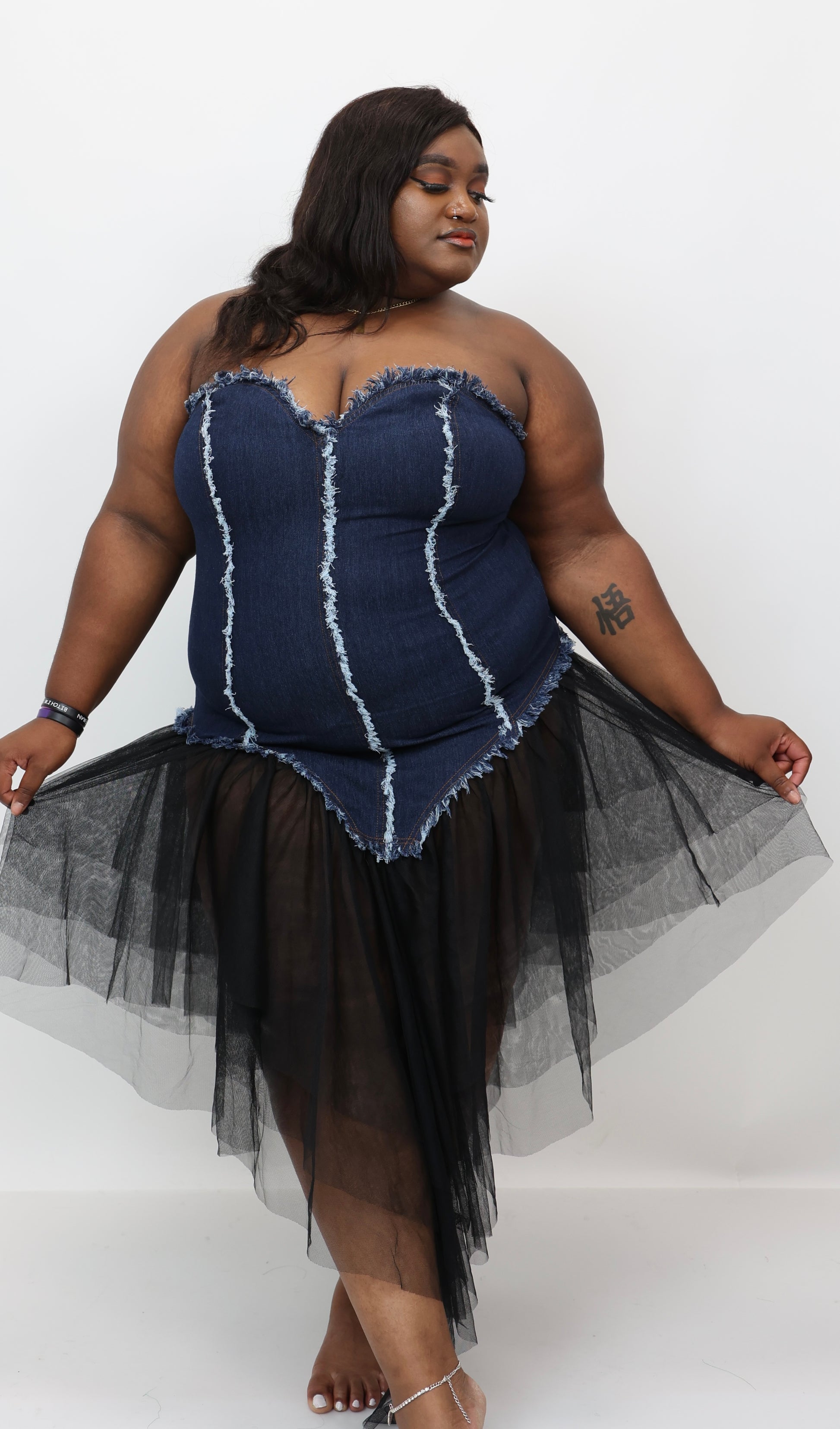 Introducing our Non-Stretch Denim Dress, available in sizes 1XL, 2XL, and 3XL. This dress combines a classic tube silhouette with a sweetheart neckline, denim fabric, tulle detailing, an asymmetrical hem, and a practical zipper closure. Crafted for both style and comfort, this dress is made from a blend of 65% Cotton, 30% Polyester, and 5% Spandex.