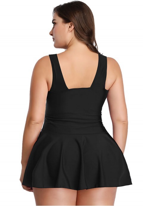 Turn heads at the pool in this flirty plus size swimsuit featuring padded cups, a V-neckline, wide shoulder straps, a ruffle skirt, and a matching bottom with a cheeky cut back.