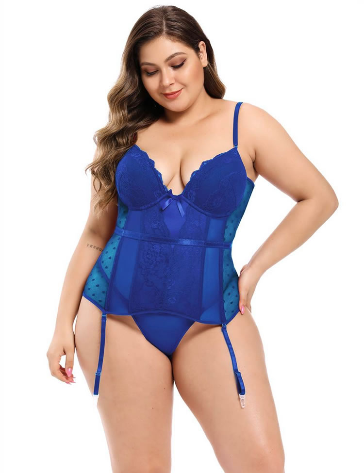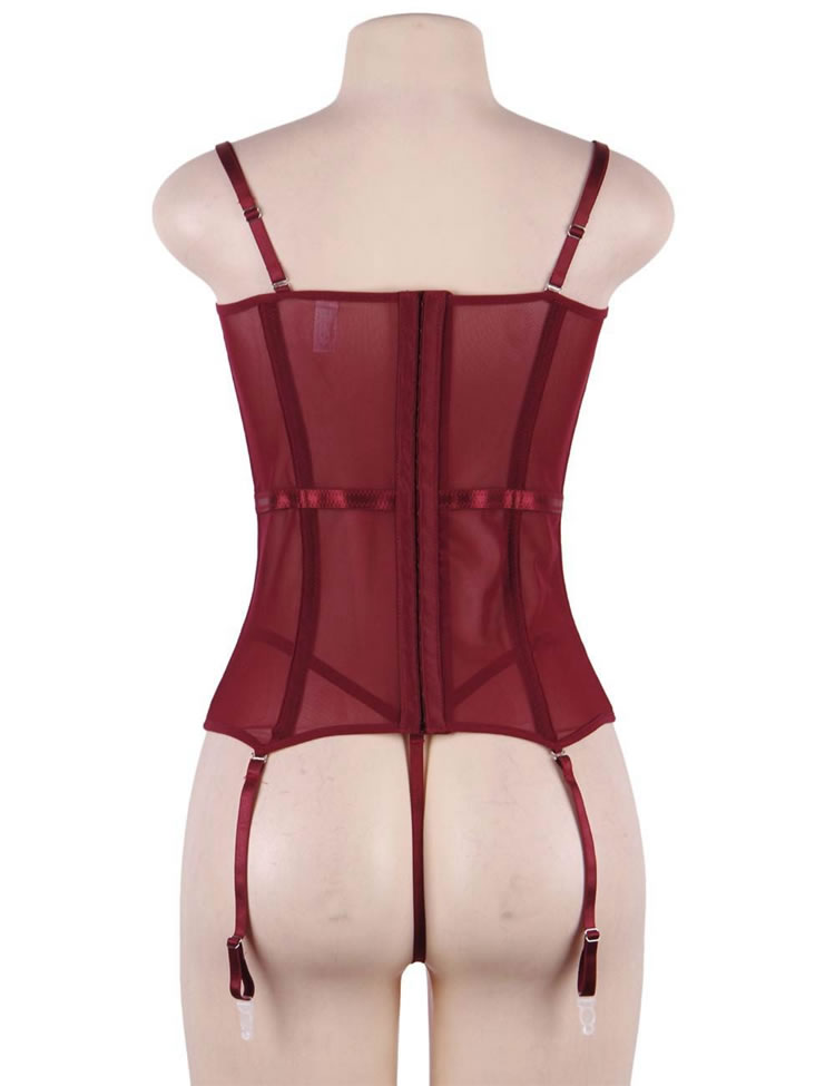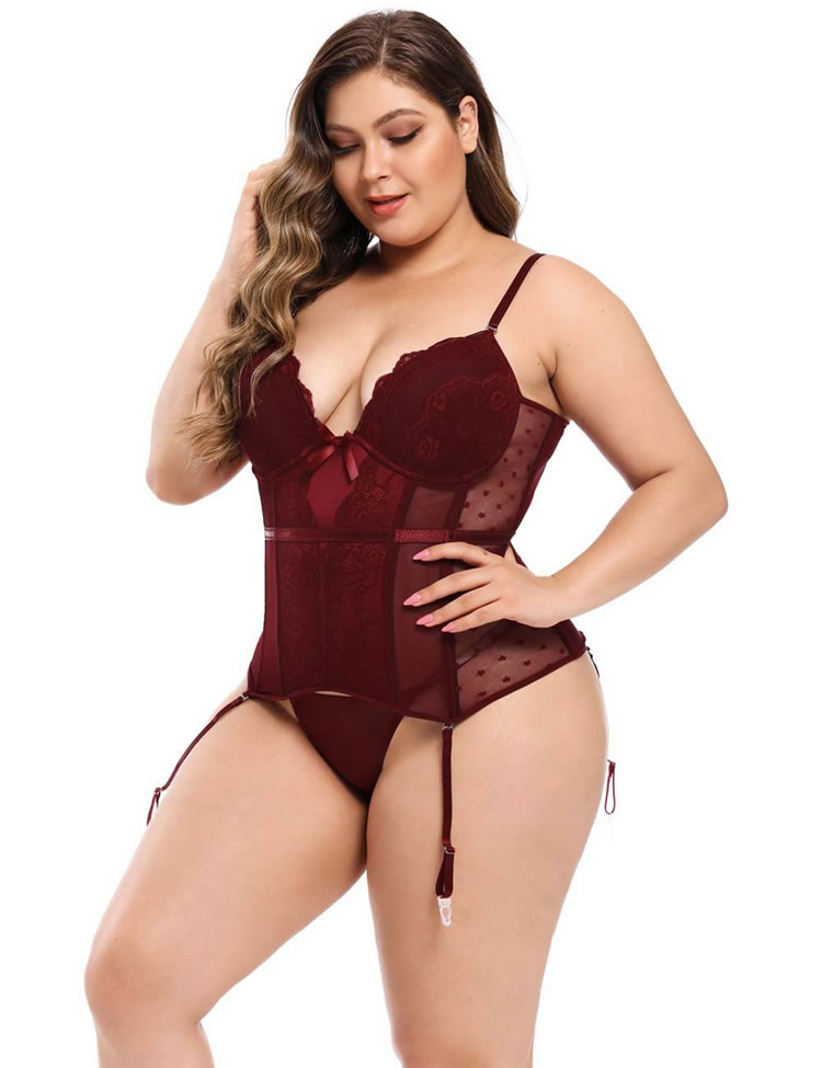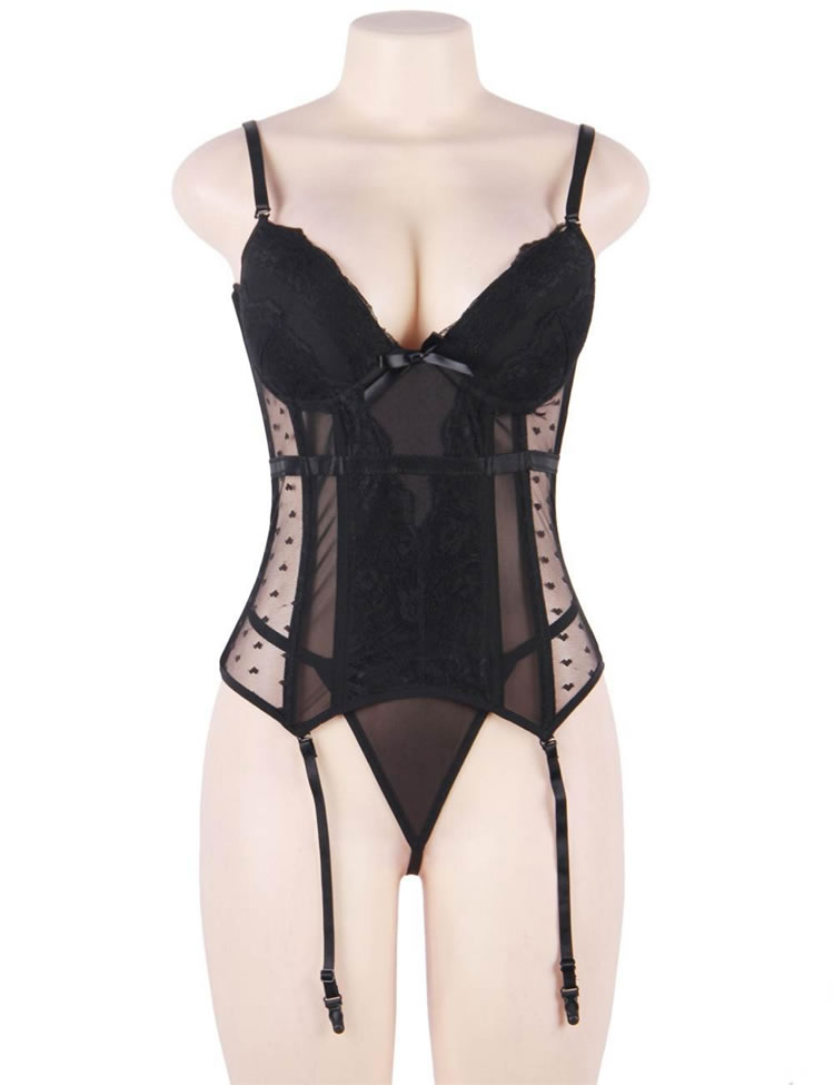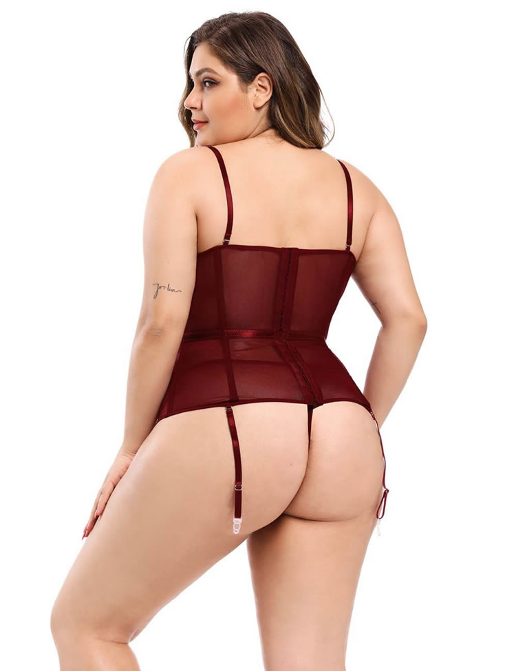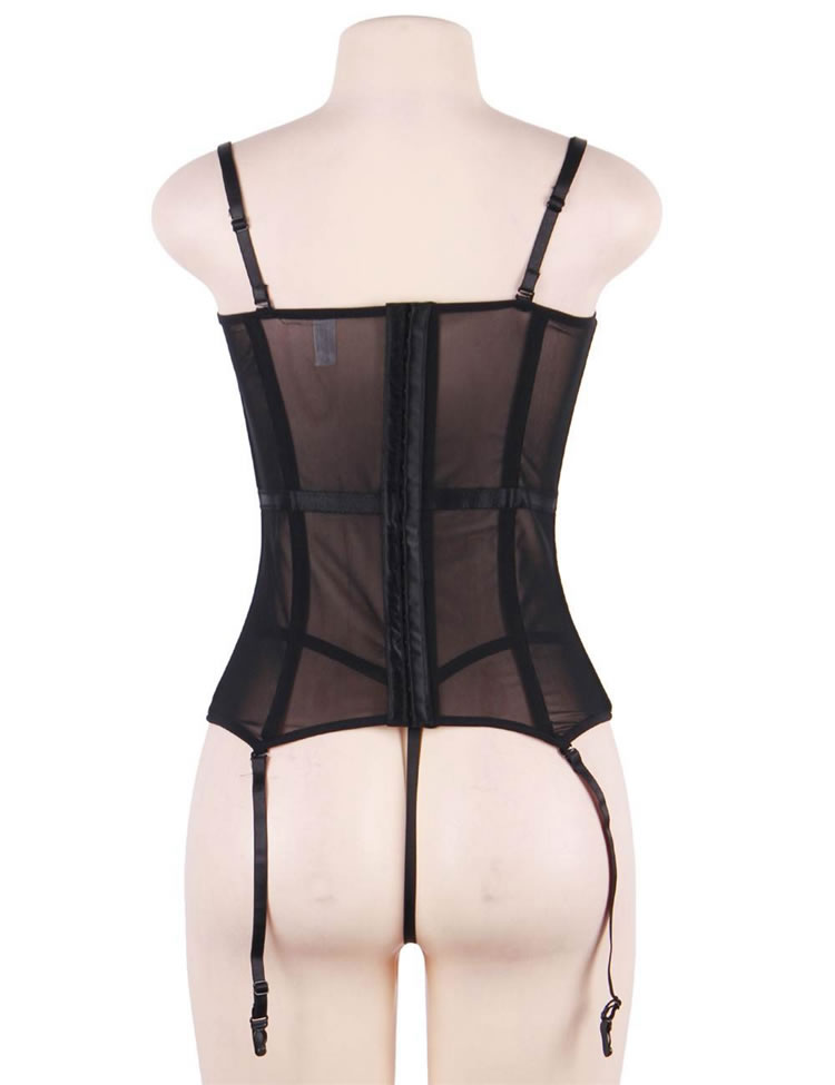 Strike a pose in this gorgeous plus size bustier set featuring molded cups, a sheer mesh and lace bodice with piped panels, a hook and eye back closure, adjustable garter straps, and a matching G-string.