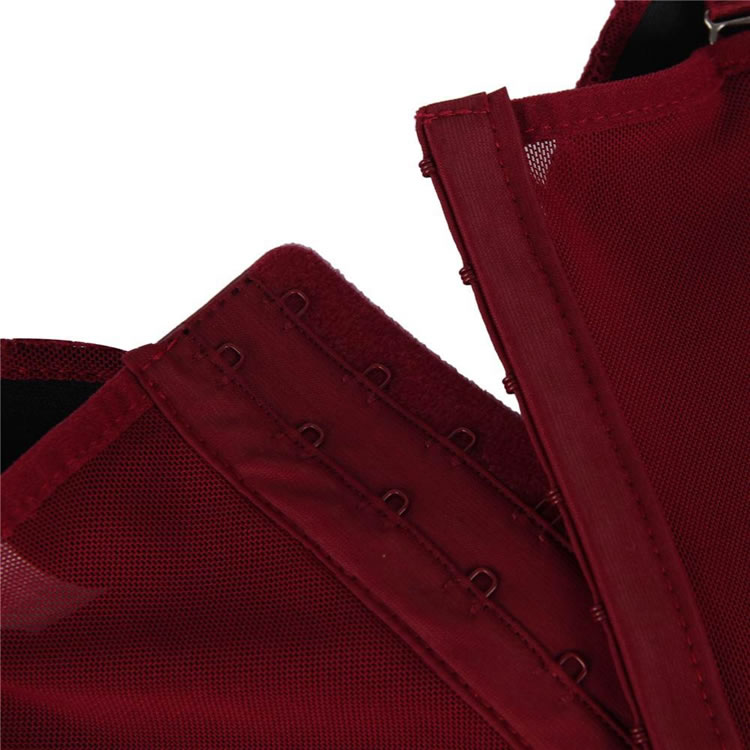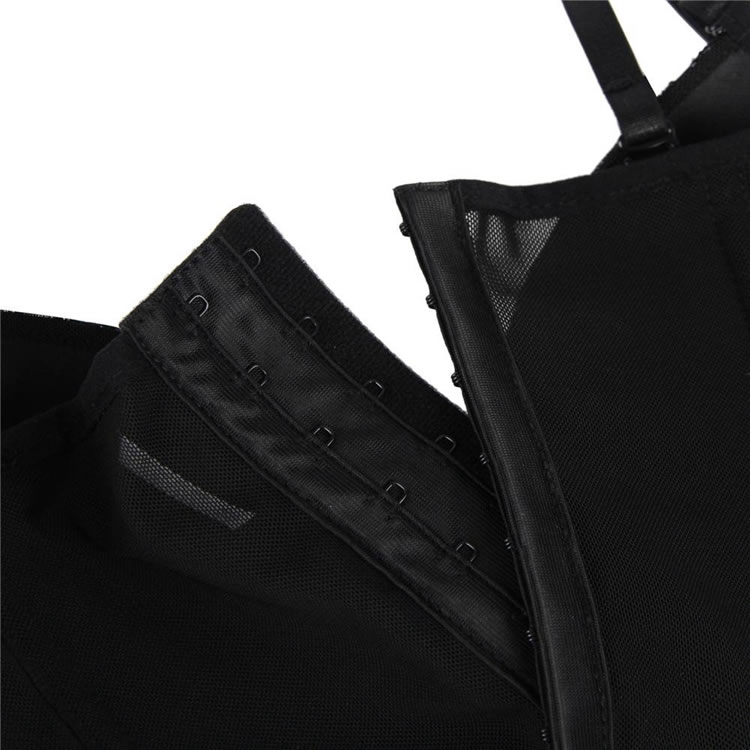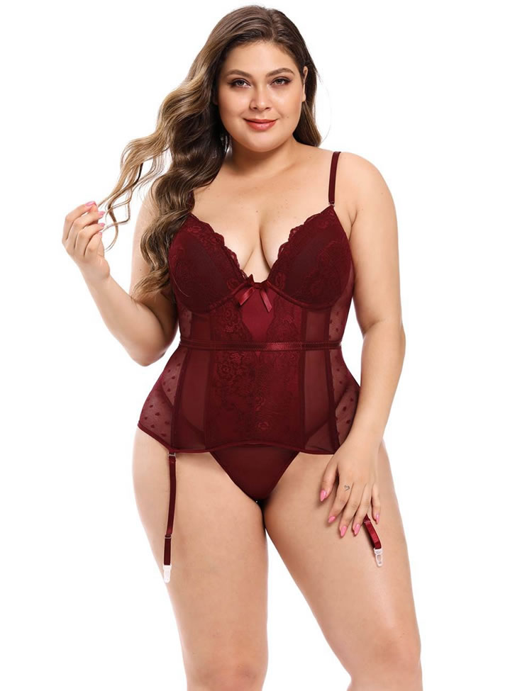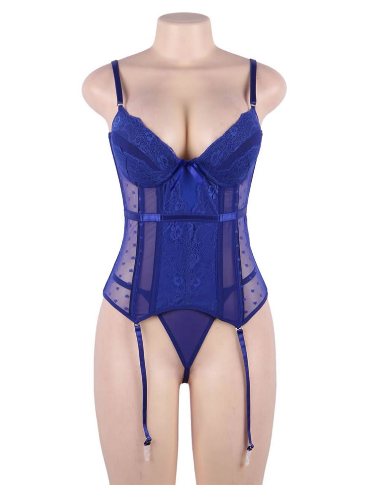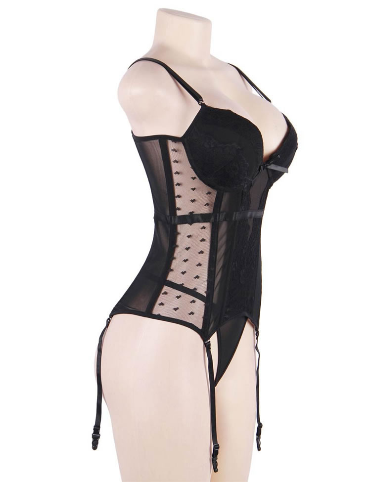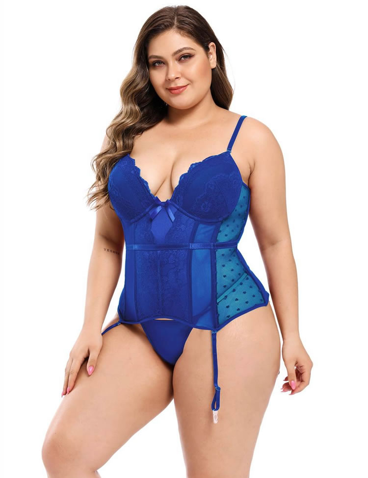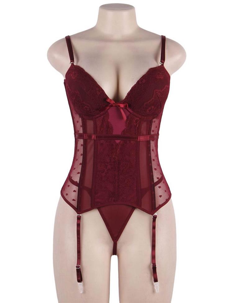 Strike a pose in this gorgeous plus size bustier set featuring molded cups, a sheer mesh and lace bodice with piped panels, a hook and eye back closure, adjustable garter straps, and a matching G-string.