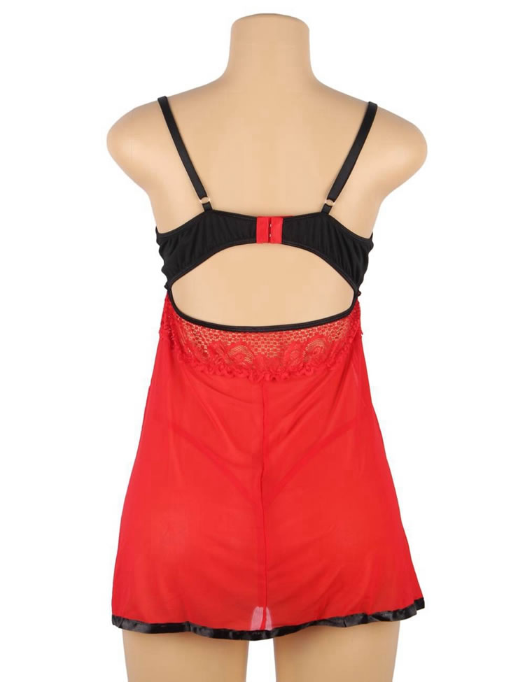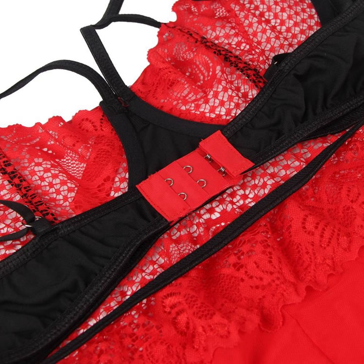Crave affection in this flirty babydoll set featuring sheer lace cups with underwire and strappy bust detailing, adjustable spaghetti straps, a hook and eye back closure with a keyhole, a flirty mesh skirt, and a matching panty.