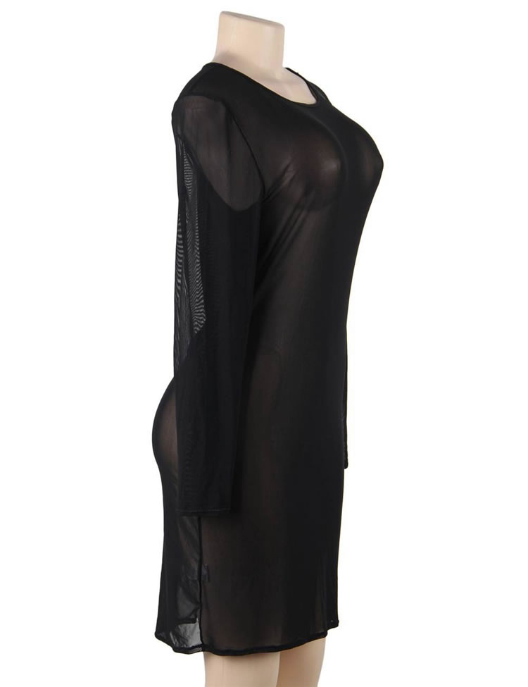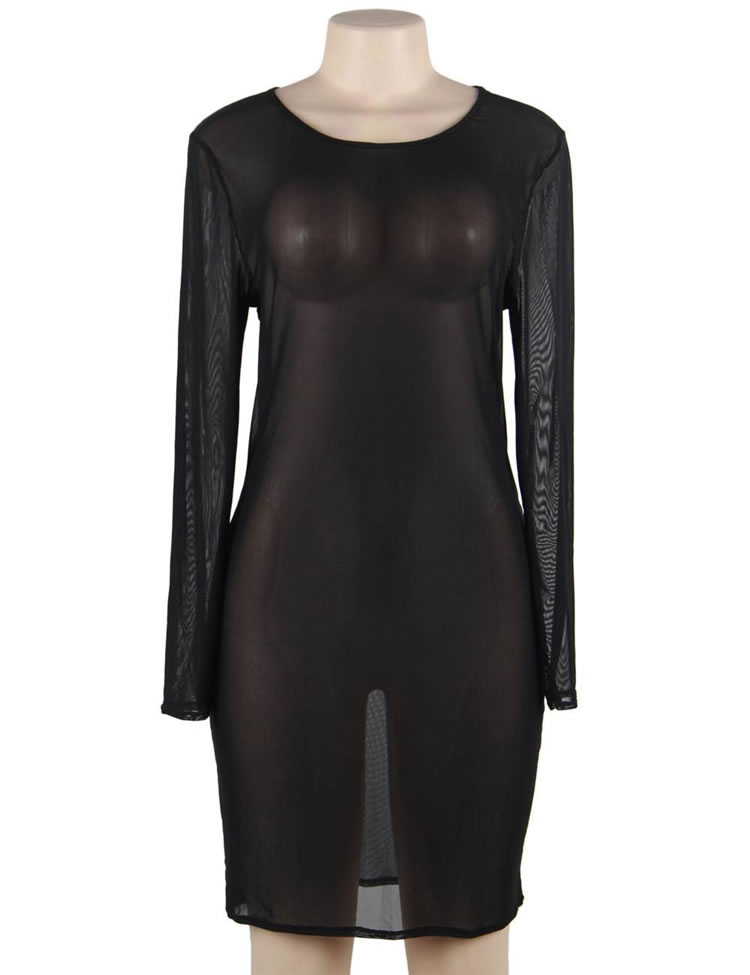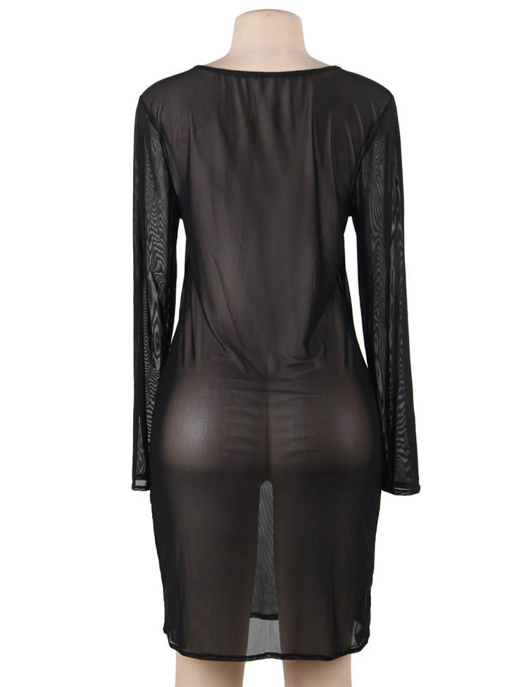 This sexy mini dress features long sleeve, round neckline and a sheer mesh bodice. (Bra set not included.)