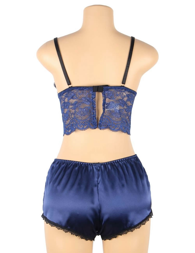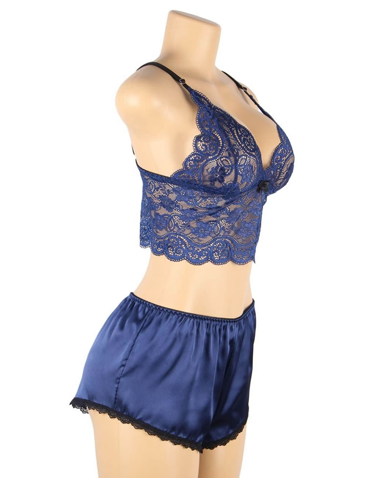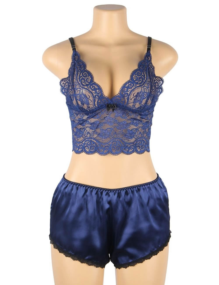 Fire up your bedtime flirtations in this sassy plus size lace and satin cami set featuring sheer lace triangle cups, adjustable spaghetti straps, a hook and eye back closure, a sheer lace underbust, and a matching satin short with an elastic, a lace hem, and a matching lace panty.