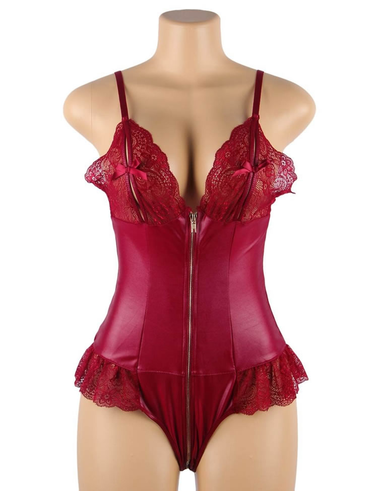 Feel the heat in this sexy teddy featuring sheer lace peek-a-boo cups with satin bow accents, adjustable spaghetti straps, an exposed gold front zipper that wraps around to the back, a faux leather bodice, a ruffled lace hem, a mesh back panel, and a cheeky cut bottom.