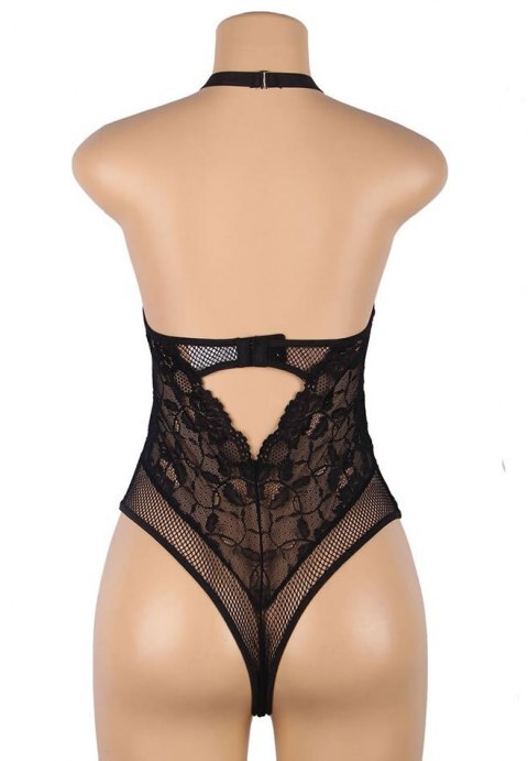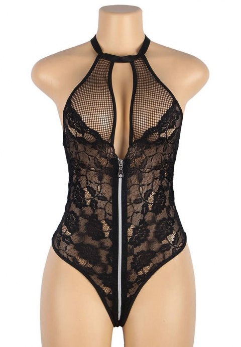Reveal your true feelings in this stunning teddy features a high neck with a hook and eye back closure, a sheer bodice with front zipper closure, a front keyhole opening, high cut sides, and a cheeky cut back.