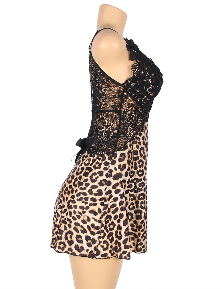 Plus Size V Neck Leopard Print Lace Stitching Strap with Flower Babydoll