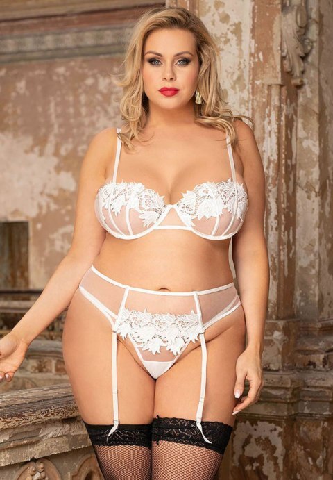 Charm your cutie in this evocative bra set featuring sheer lace cups with underwire, adjustable spaghetti straps, a hook and eye back closure, a matching lace garter belt with a hook and eye back closure, adjustable garter straps, and a matching panty with a strappy waist, and a thong cut back. (Stockings not included.)