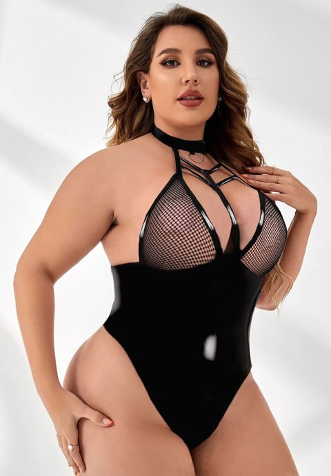 Embrace a timeless and elegant silhouette with this faux leather teddy. Available in black, it features halter straps, fishnet paneling, and a cheeky cut back, exuding both sophistication and empowerment.