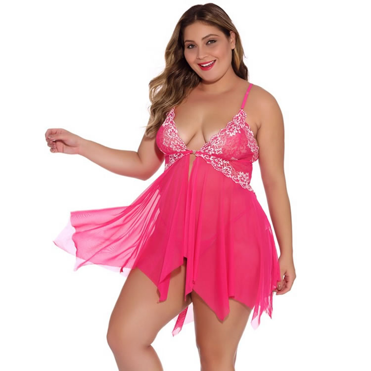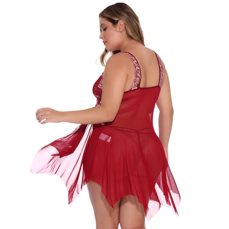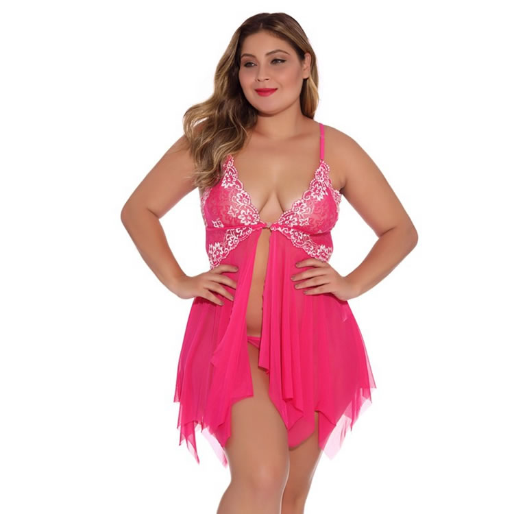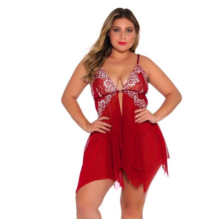 Dare to divulge all your dirty secrets in this sexy plus size babydoll set featuring sheer lace cups with a scalloped trim, adjustable spaghetti straps with lace detailing, a hook front closure, a loose mesh bodice with a vented open front, an asymmetrical hem, and a matching thong panty.