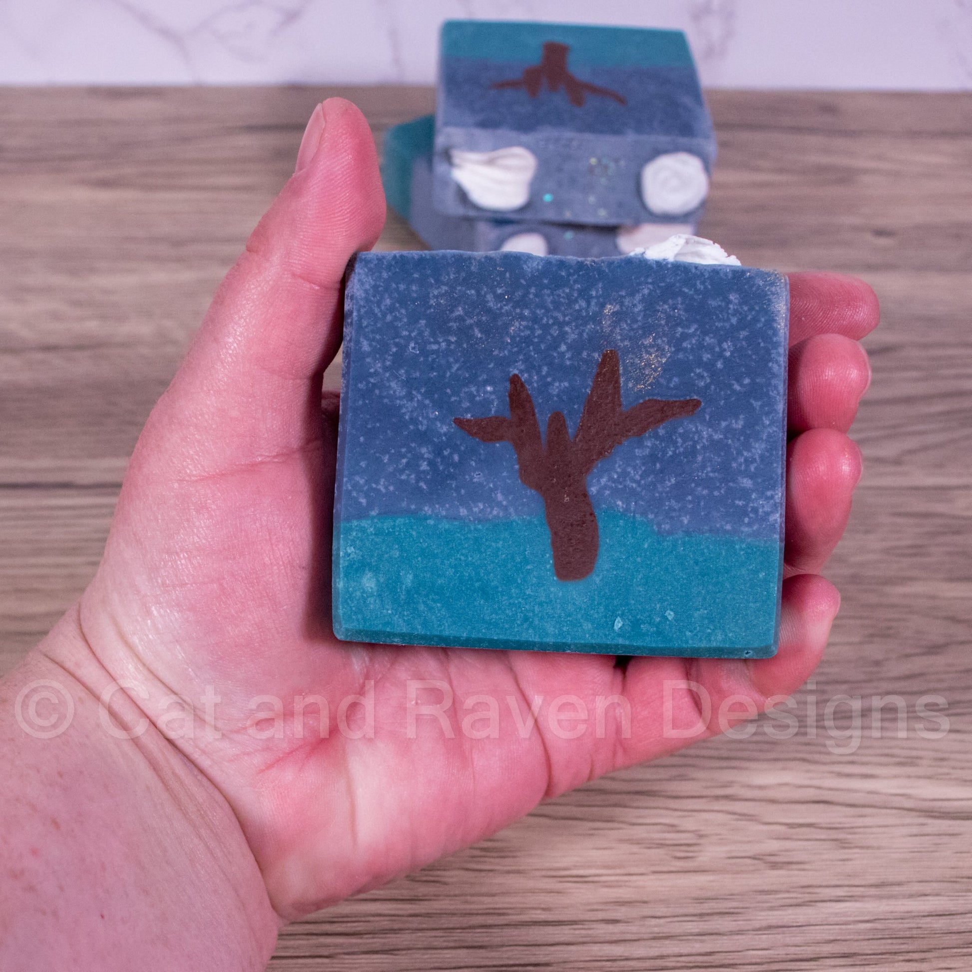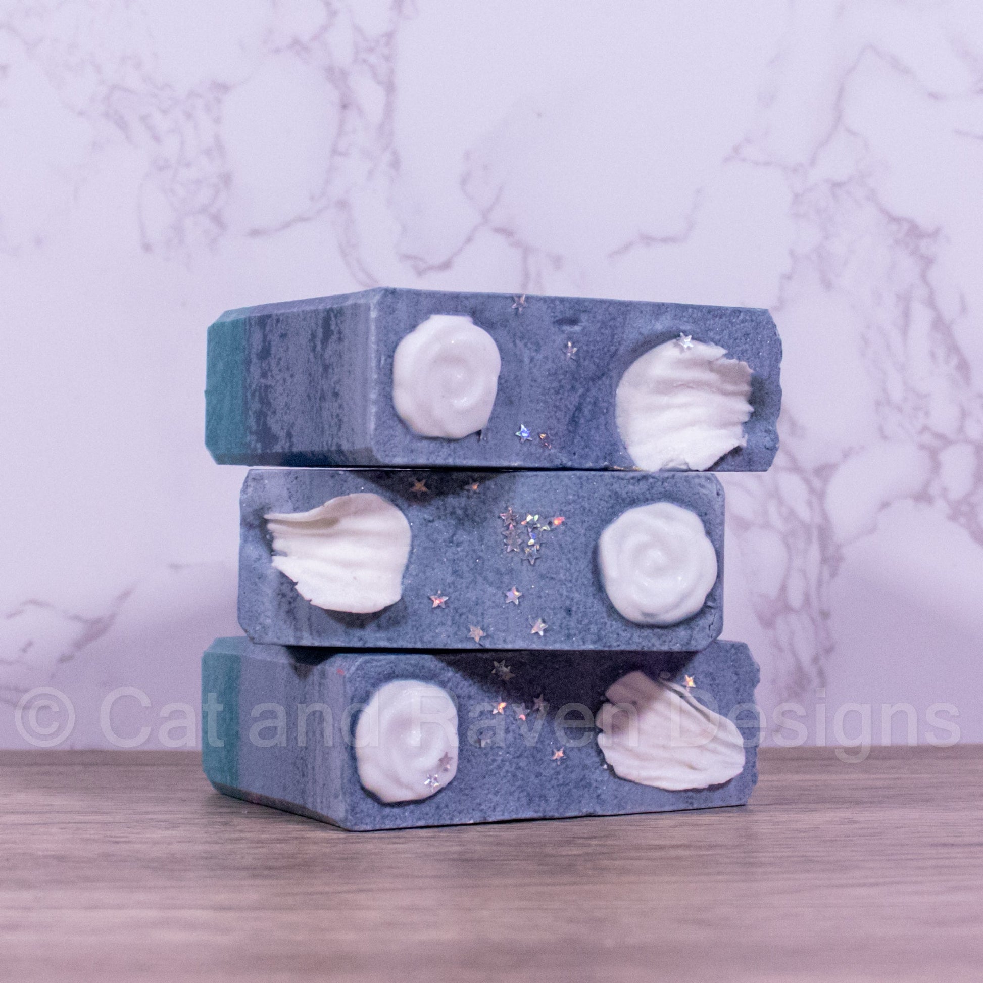 Ingredients: olive oil, rice bran oil, coconut oil, palm oil (RSPO), sodium hydroxide, almond oil, castor oil, shea butter, cocoa butter, cornstarch, glycerin melt & pour embeds, sodium lactate, fragrance, micas, and biodegradable glitter.
