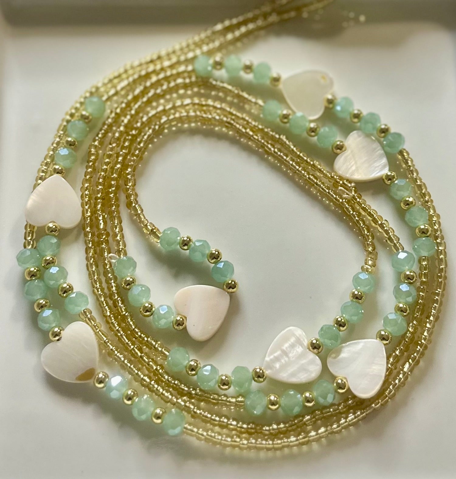 Soft elegance meets luminous strength in this mint green, gold, and pearl hearts waistbead set—a delicate yet powerful adornment designed to inspire grace and love.