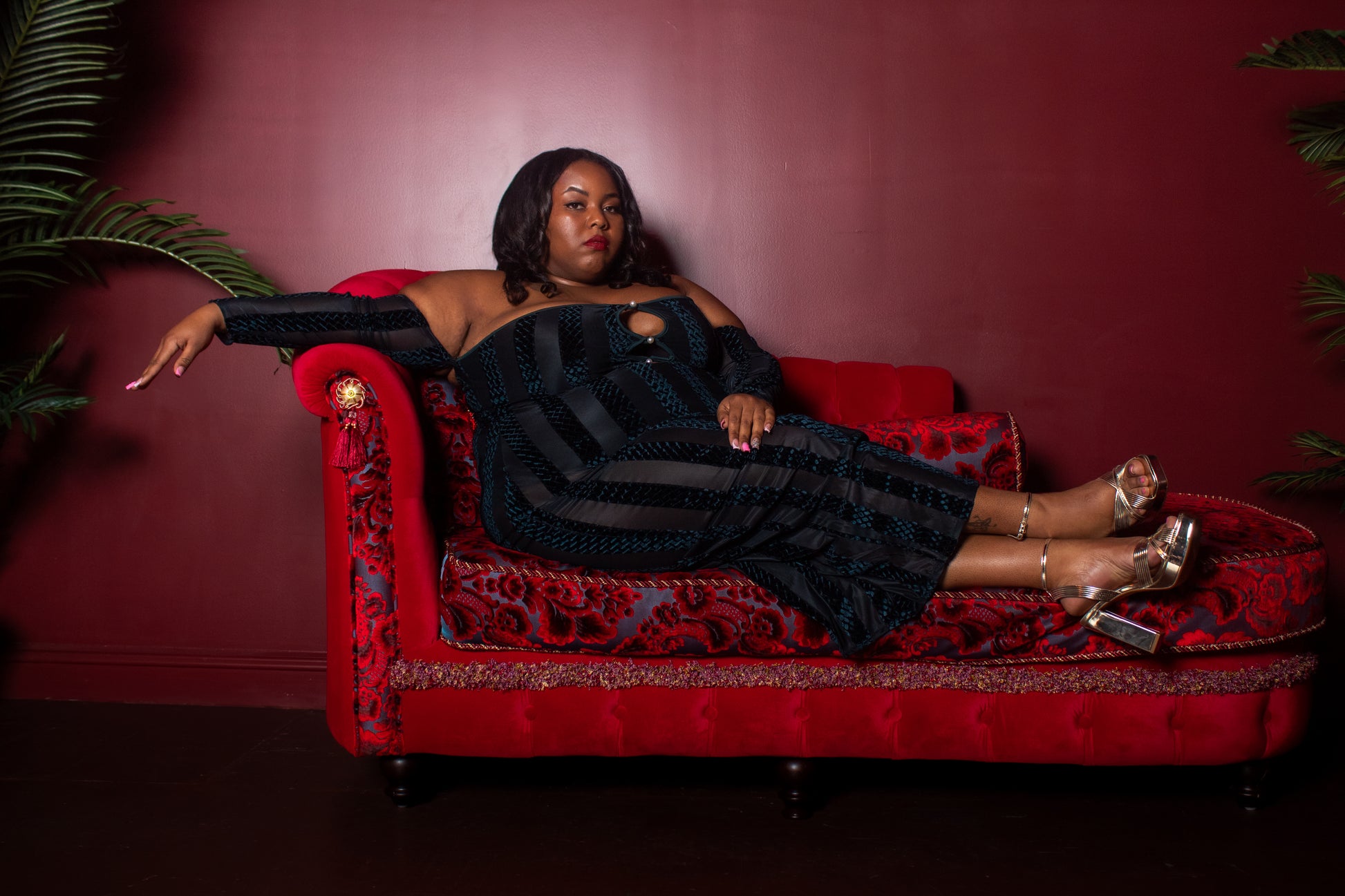 • Luxurious Striped Velvet Detailing: The striped velvet adds a touch of sophistication and texture to the dress.