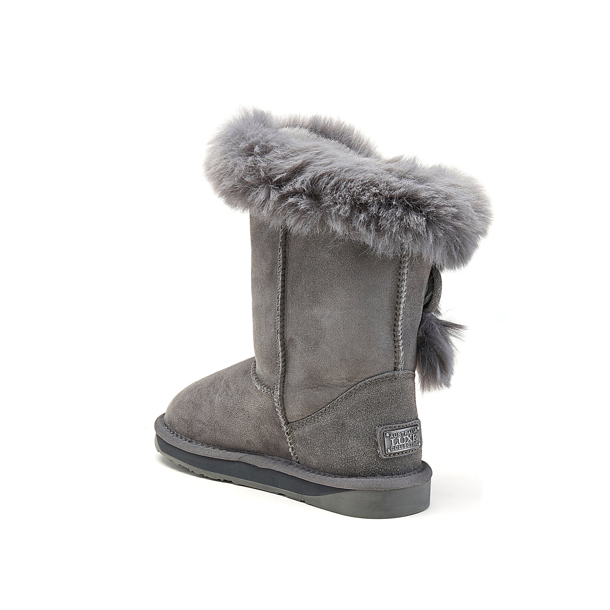 Luxe classic silhouette in a mini me version, Kids Nordic Short is the perfect mid calf length winter style. Suede outer, double face grade A sheepskin and super soft and cosy Luxe faux fur wrap around detail. Metal button and cord lace side fastening.