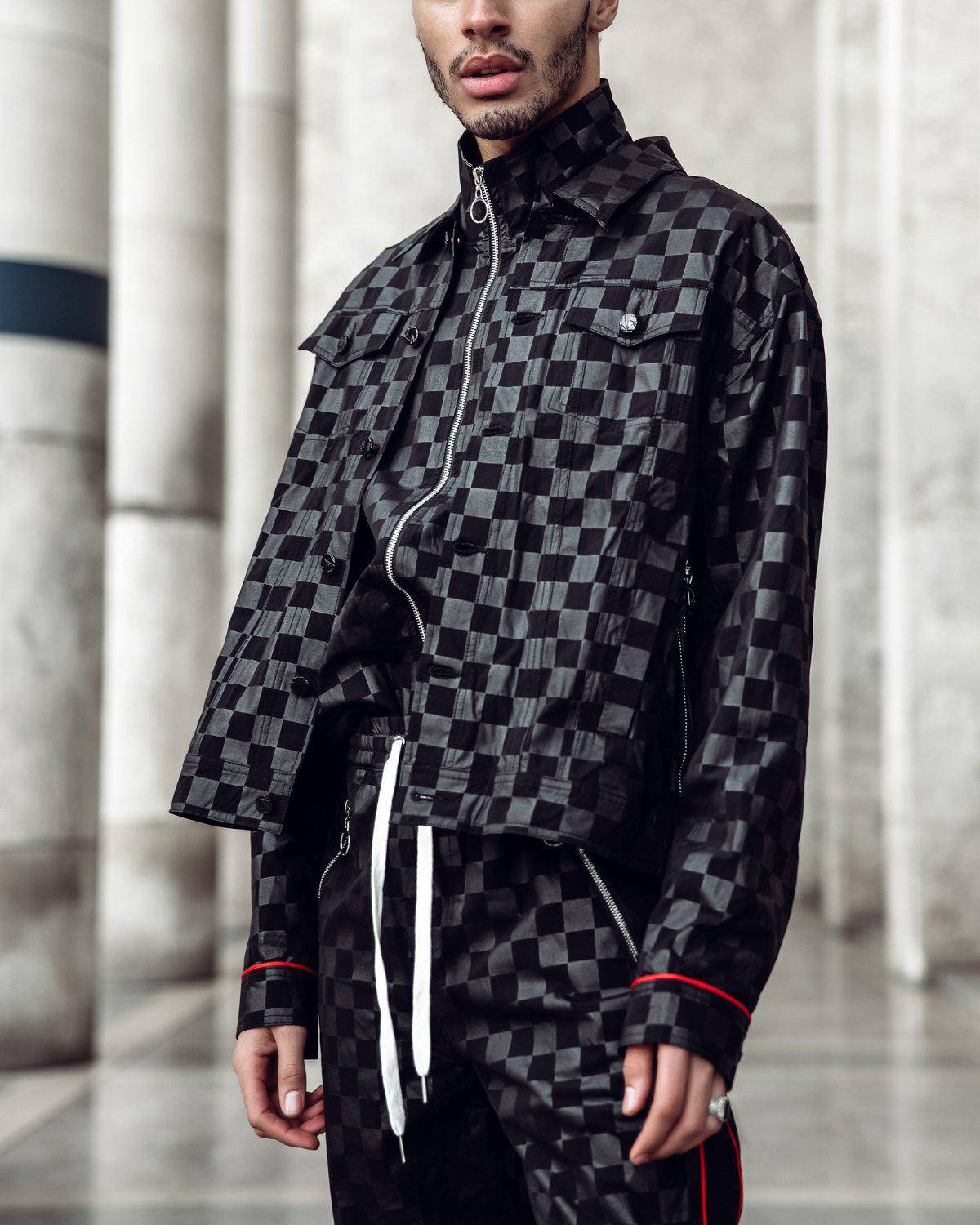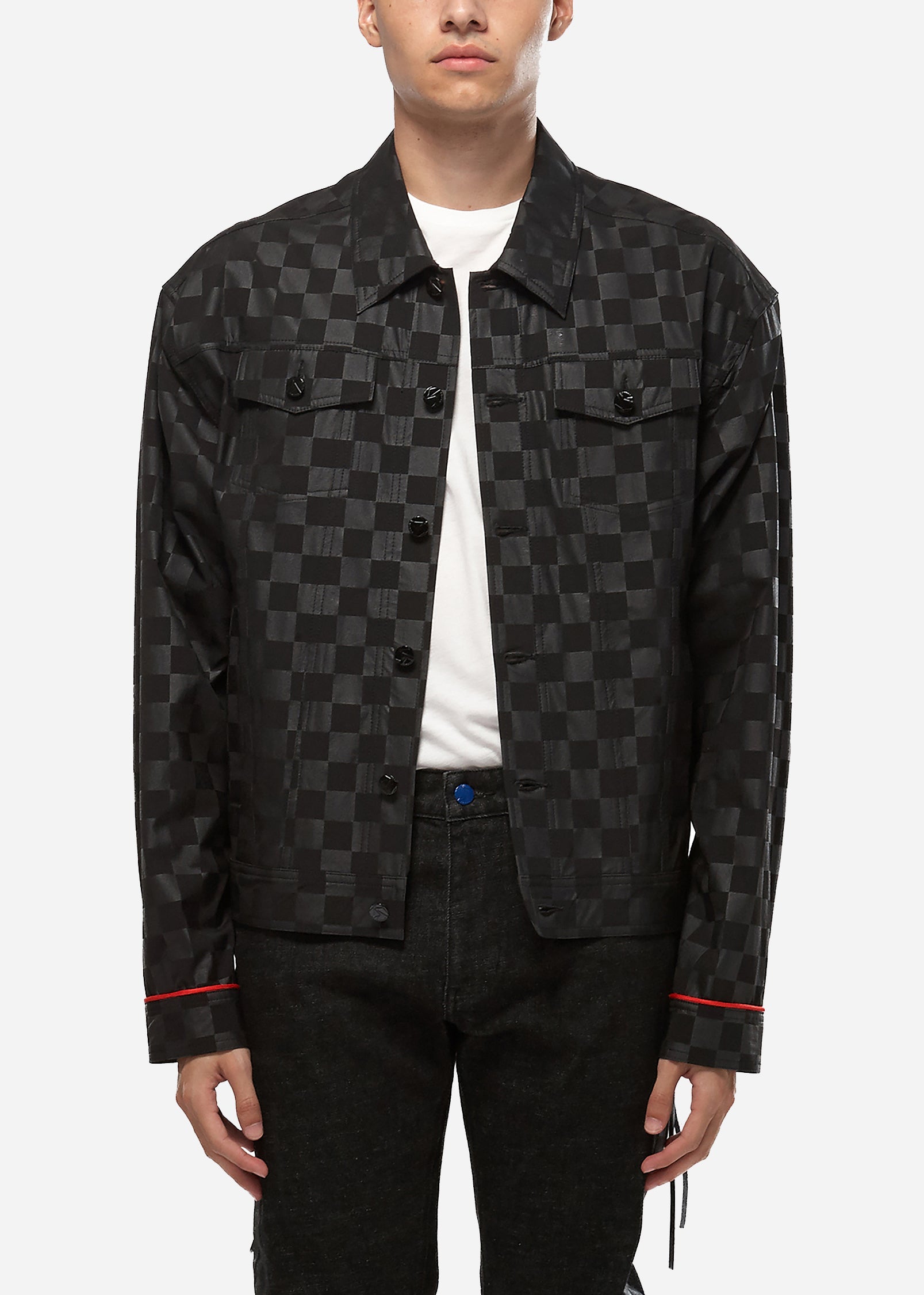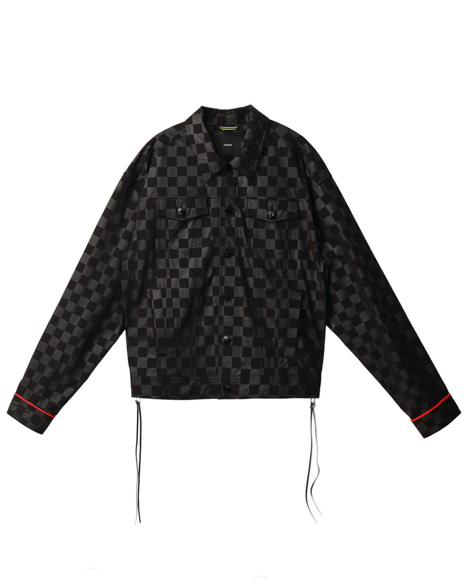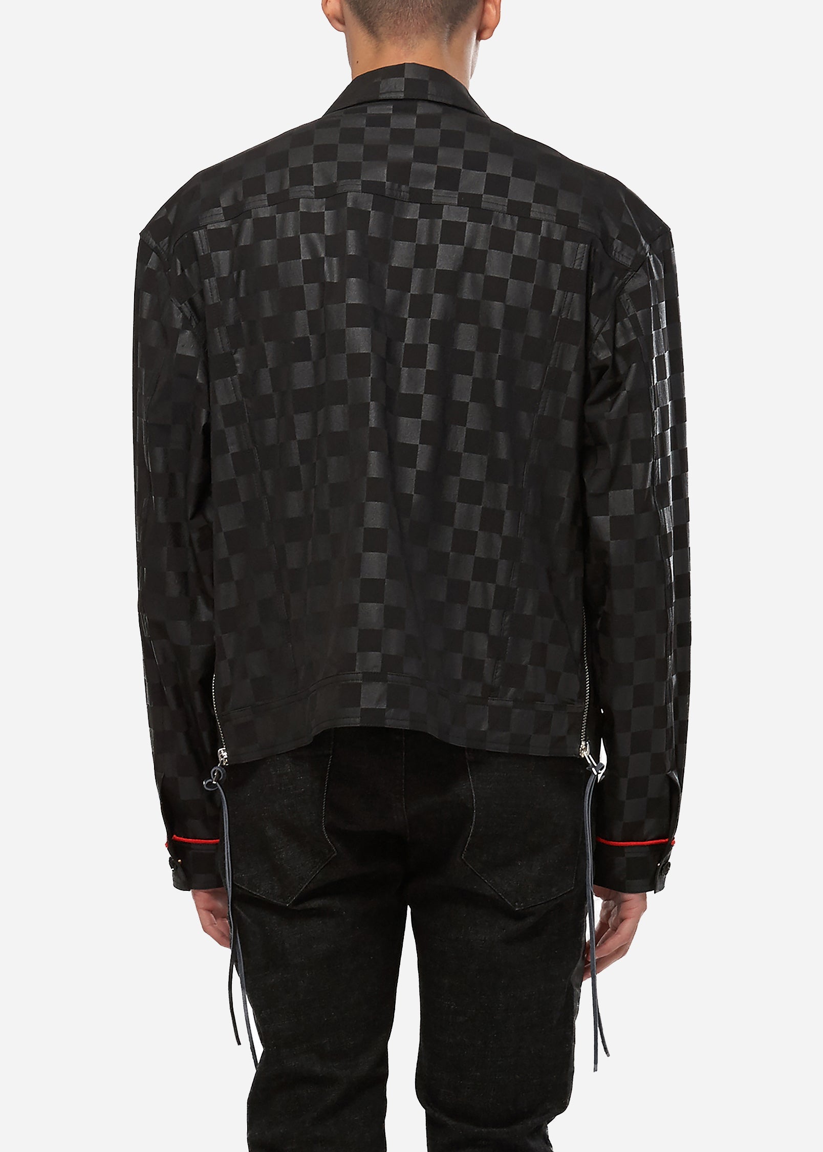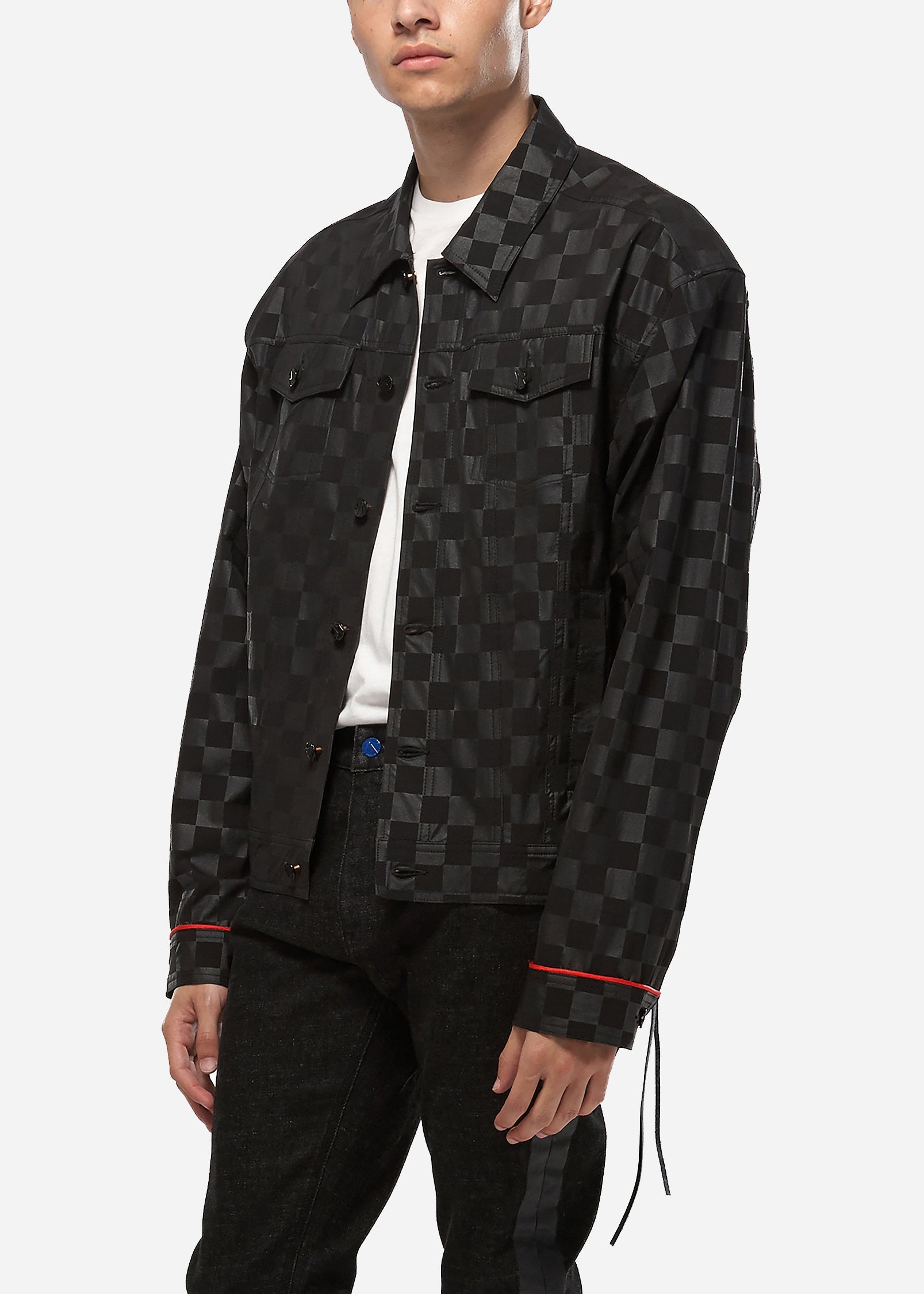 Trucker jacket in tonal checker printed fabric with red piping details at cuffs. Also features heavy zippers with black leather cords at the side seams.