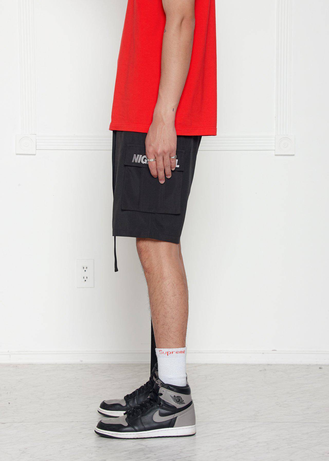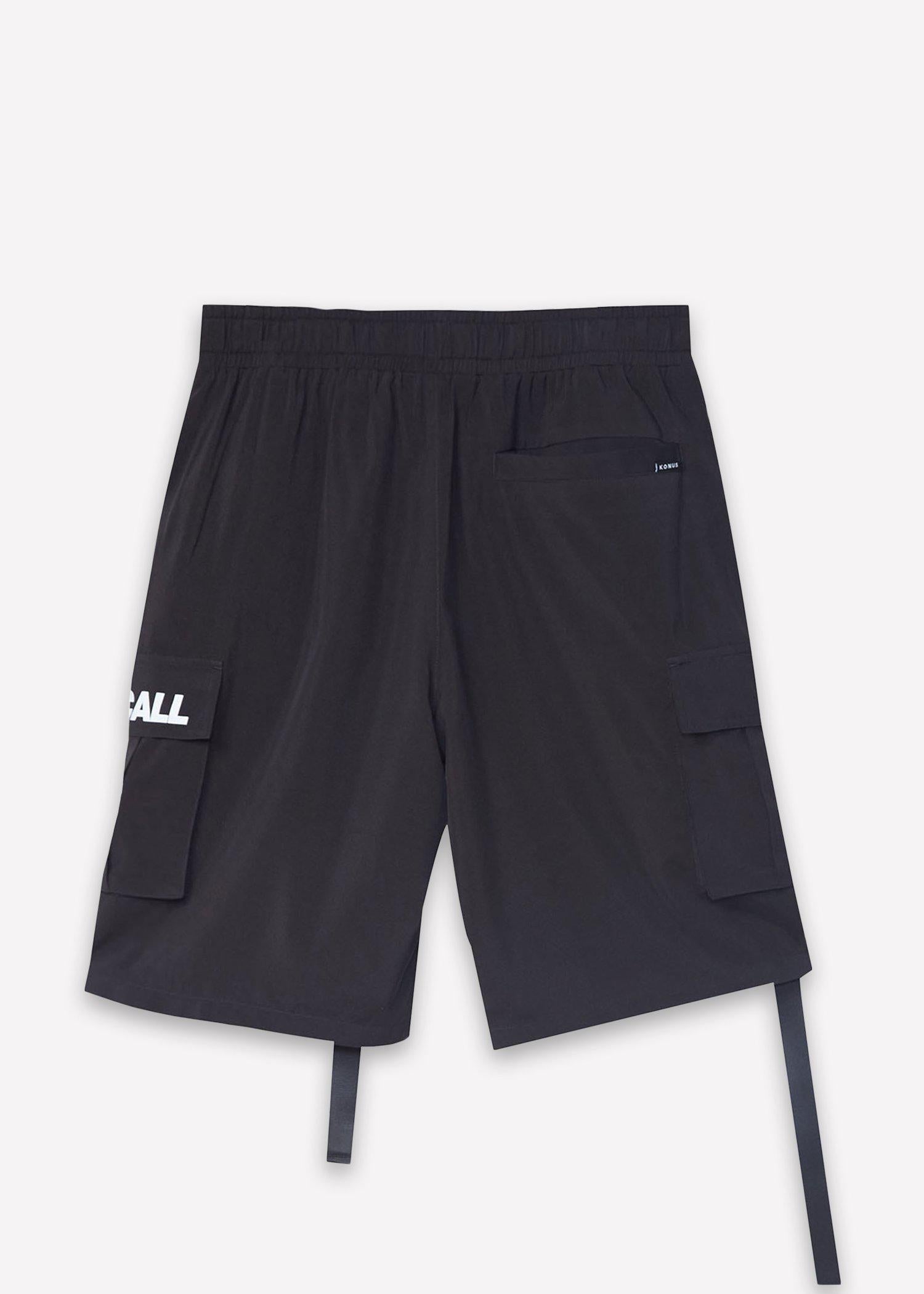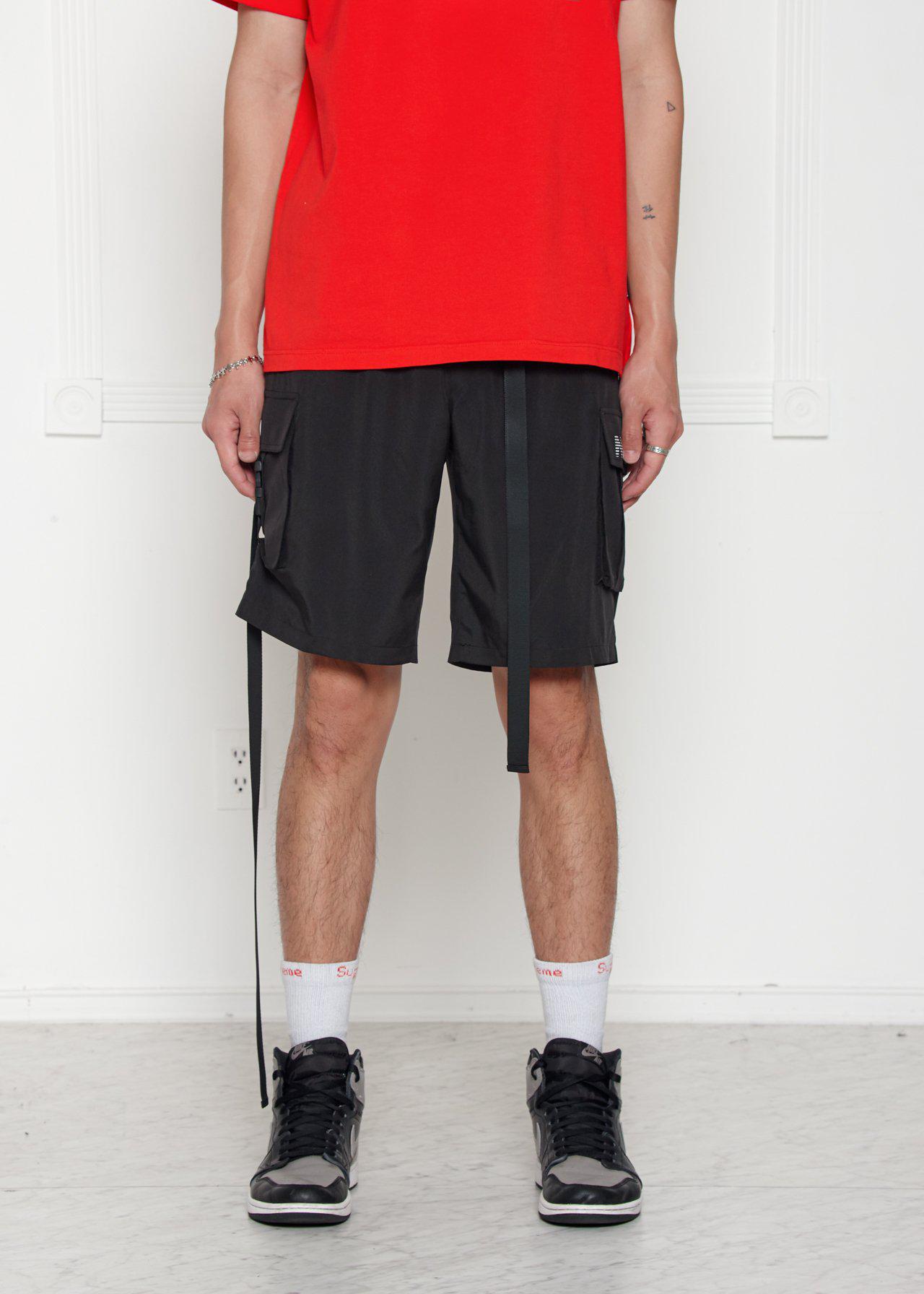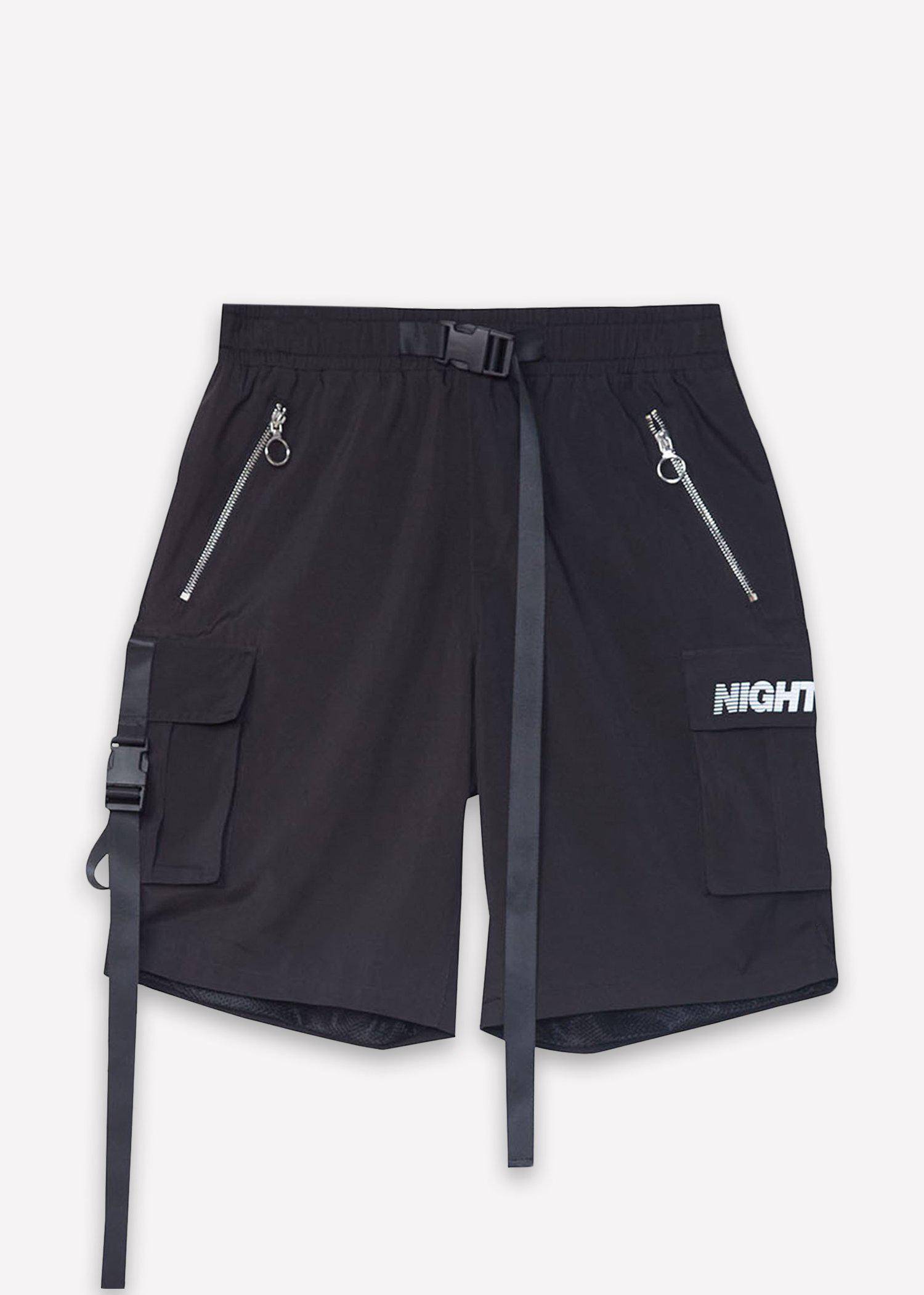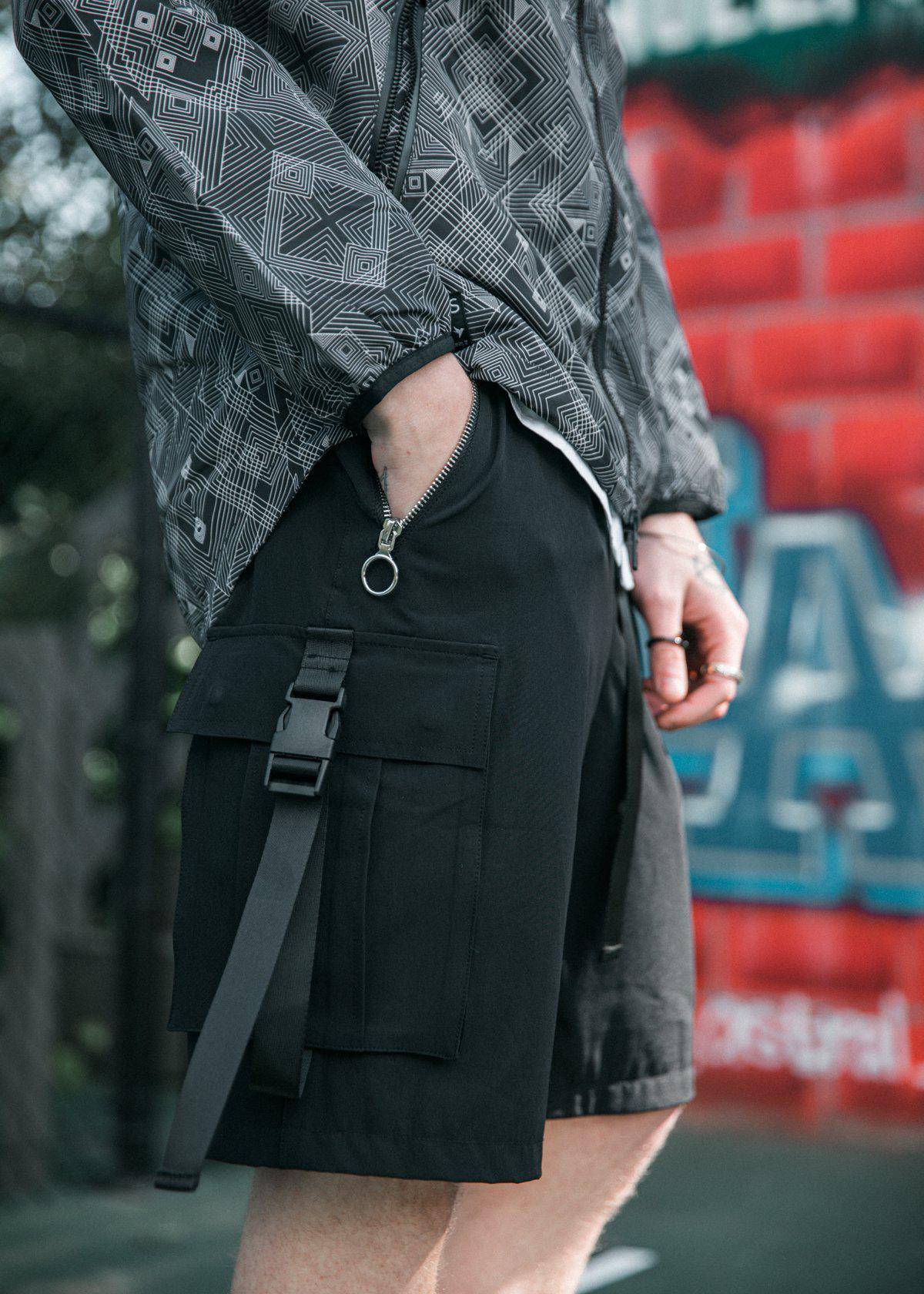Elastic waistband shorts feature a nylon tape and buckle closure, along with a zippered front pocket and a welt back pocket. They also include cargo pockets with nylon tape and buckle on one side, complete with reflective print.