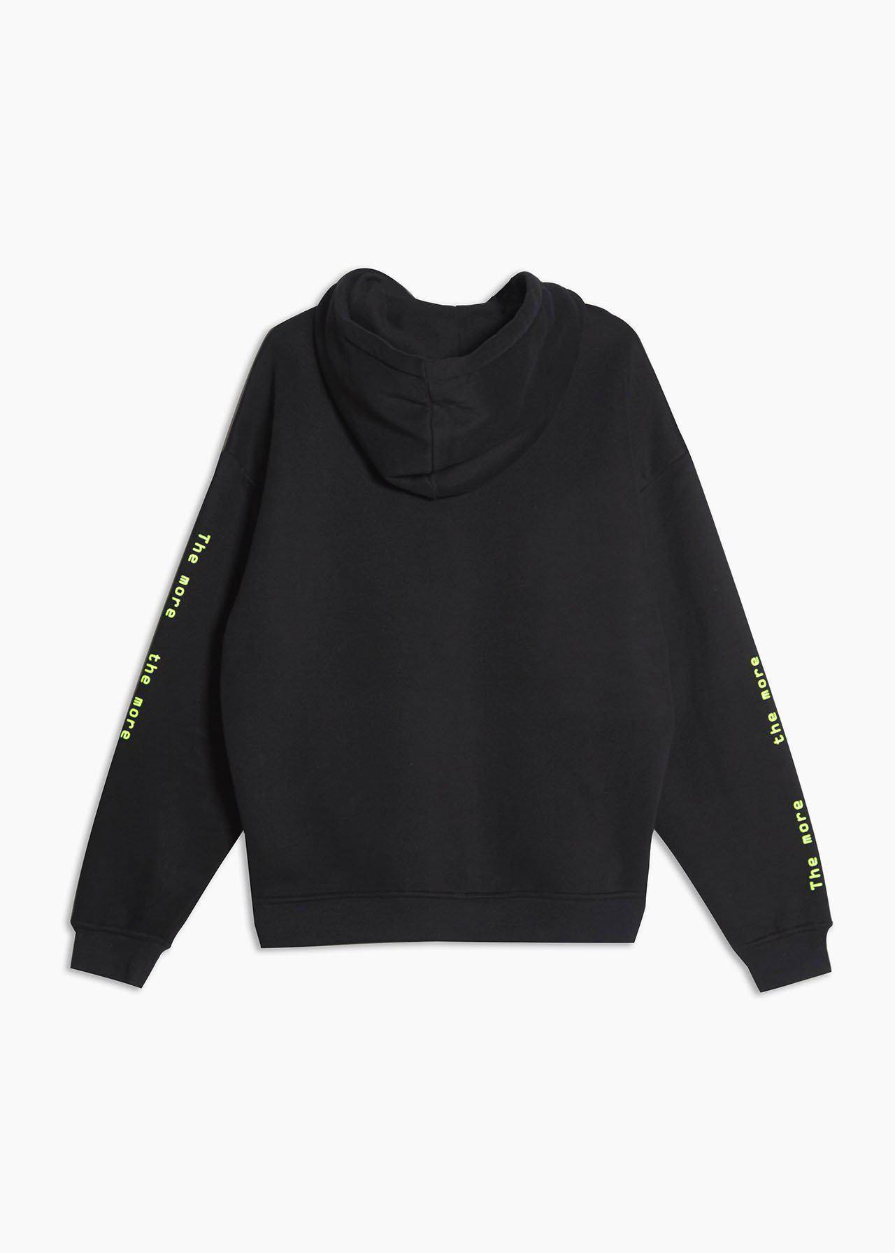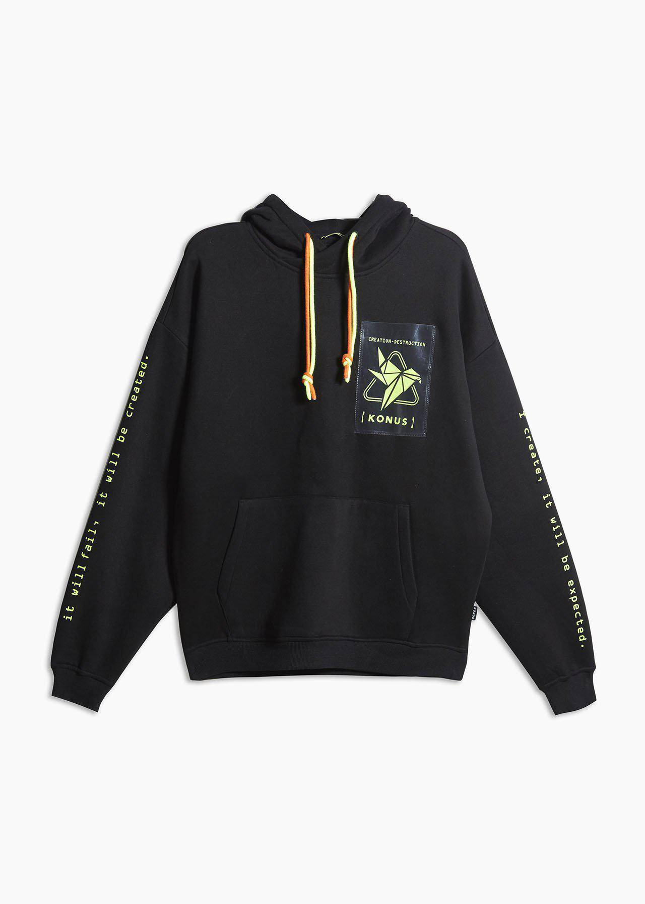 A heavyweight pullover hoodie with screen print on sleeves and chest features a clear see-through chest pocket. Also comes with double neon color draw cords.
