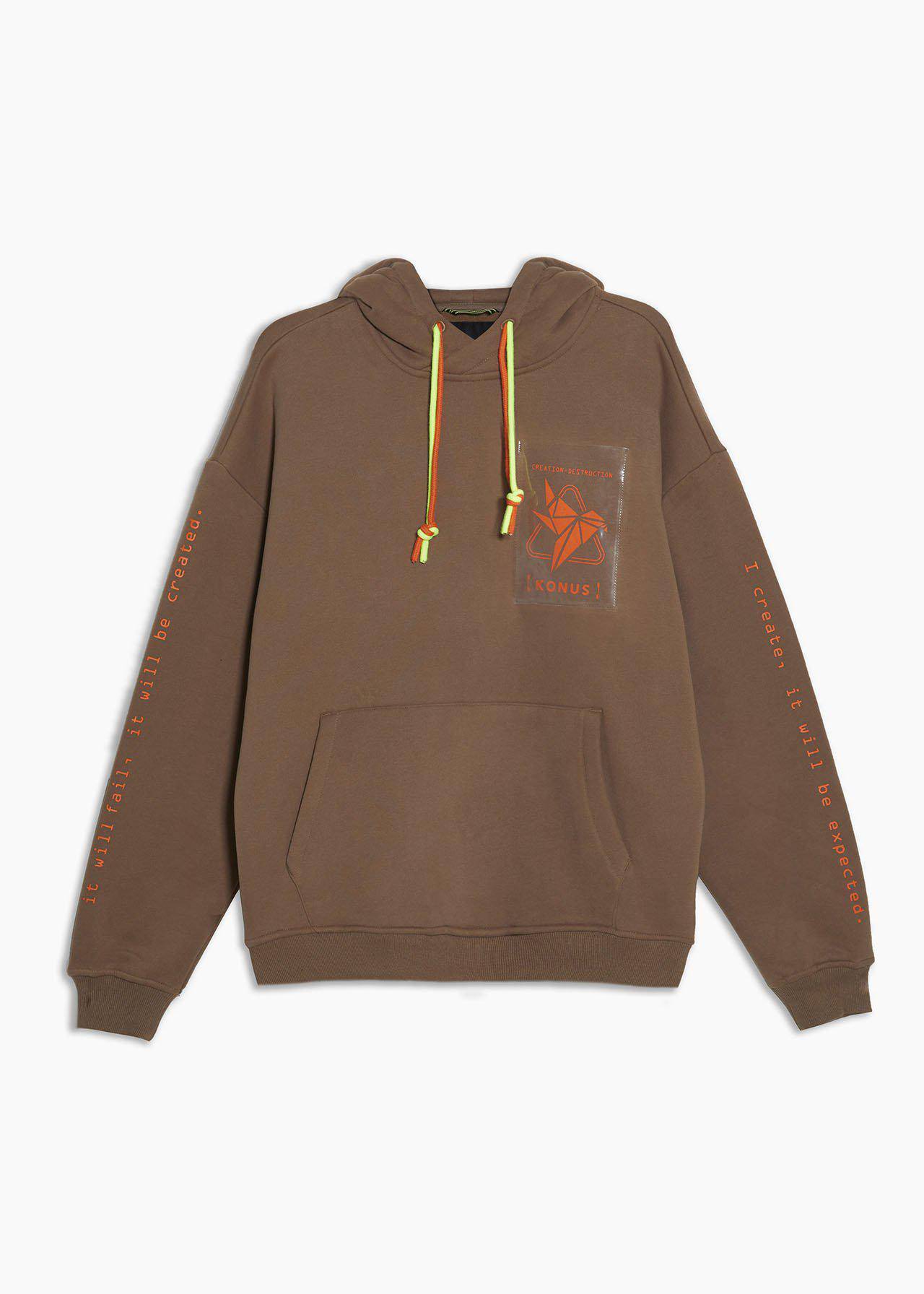 A heavyweight pullover hoodie with screen print on sleeves and chest features a clear see-through chest pocket. Also comes with double neon color draw cords.