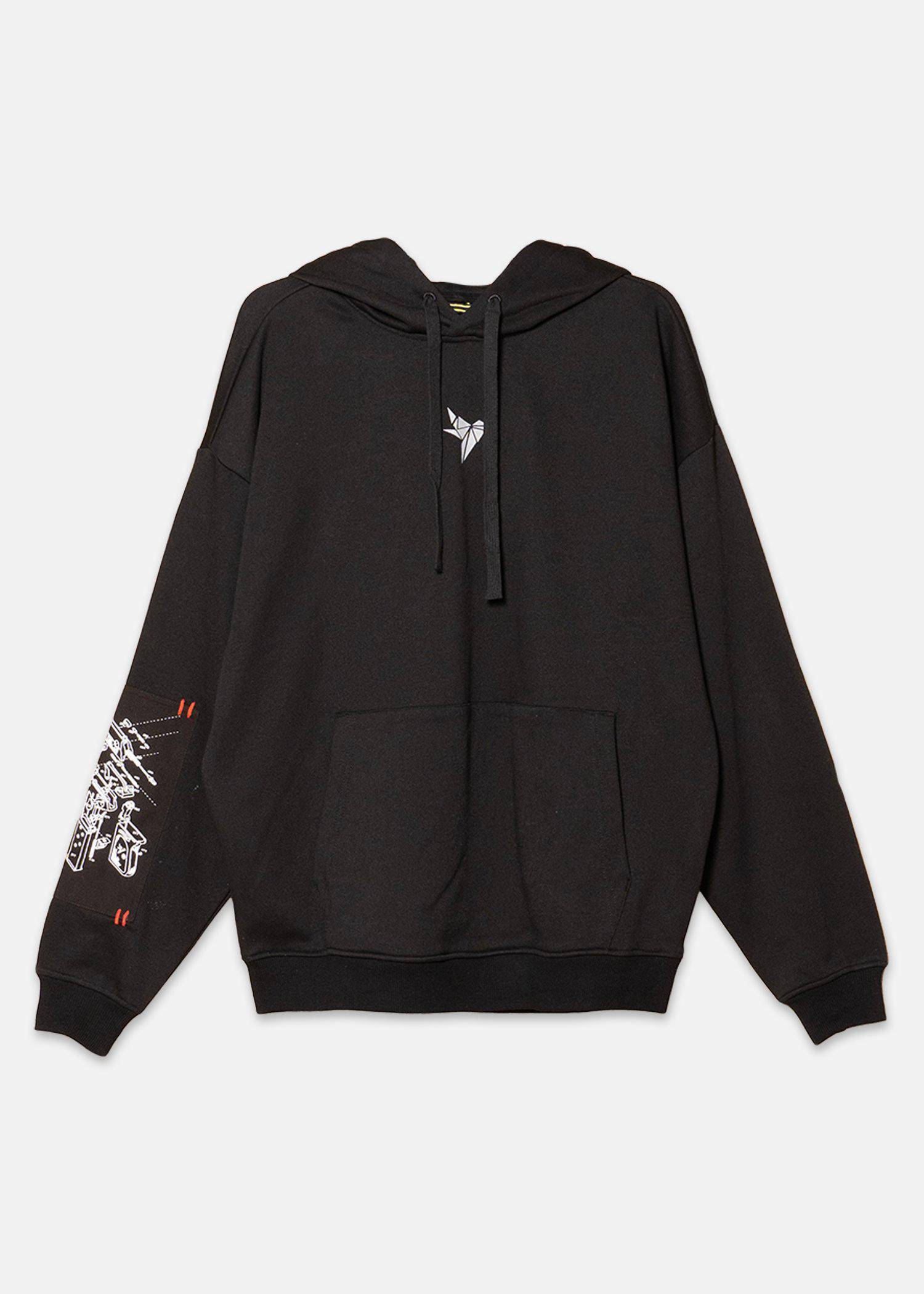 Oversized pullover hoodie made from French terry, featuring a bird logo print on the chest, a logo print on the left sleeve, and a printed twill patch on the right sleeve. The twill patch includes hand-crocheted embroidery at all four corners.