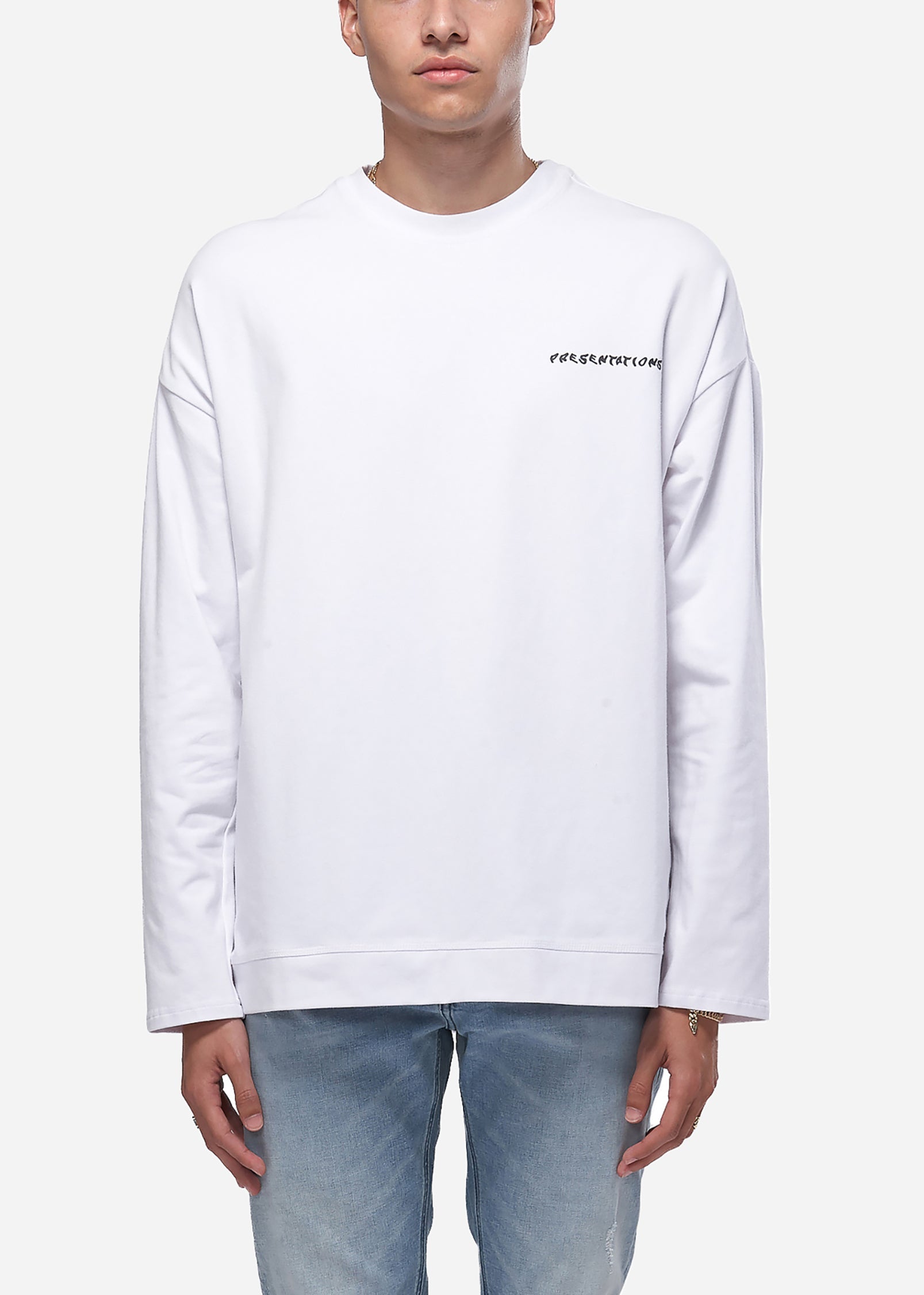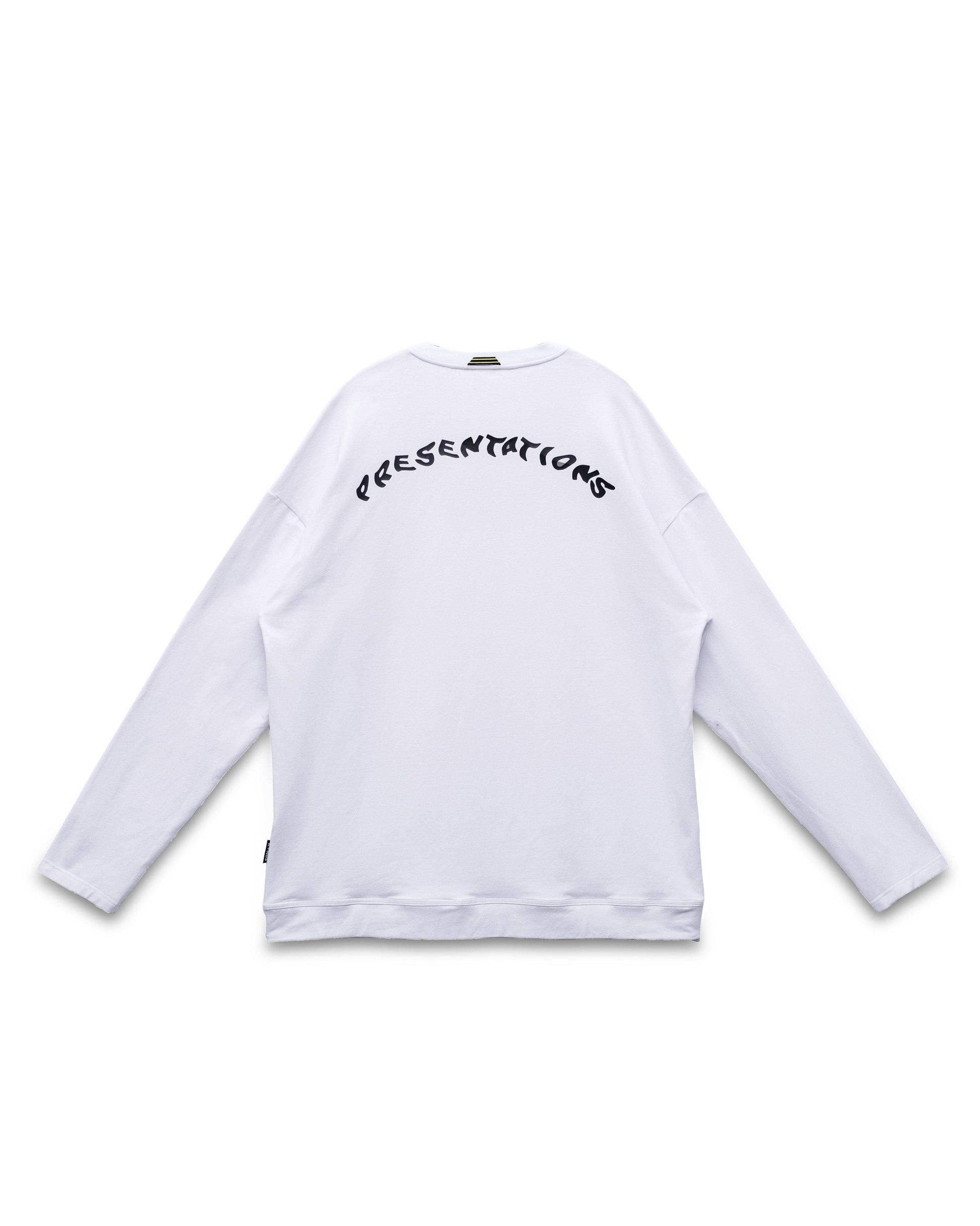 Slightly oversized long-sleeve crewneck tee with "PRESENTATIONS" printed on the left chest and across the back.