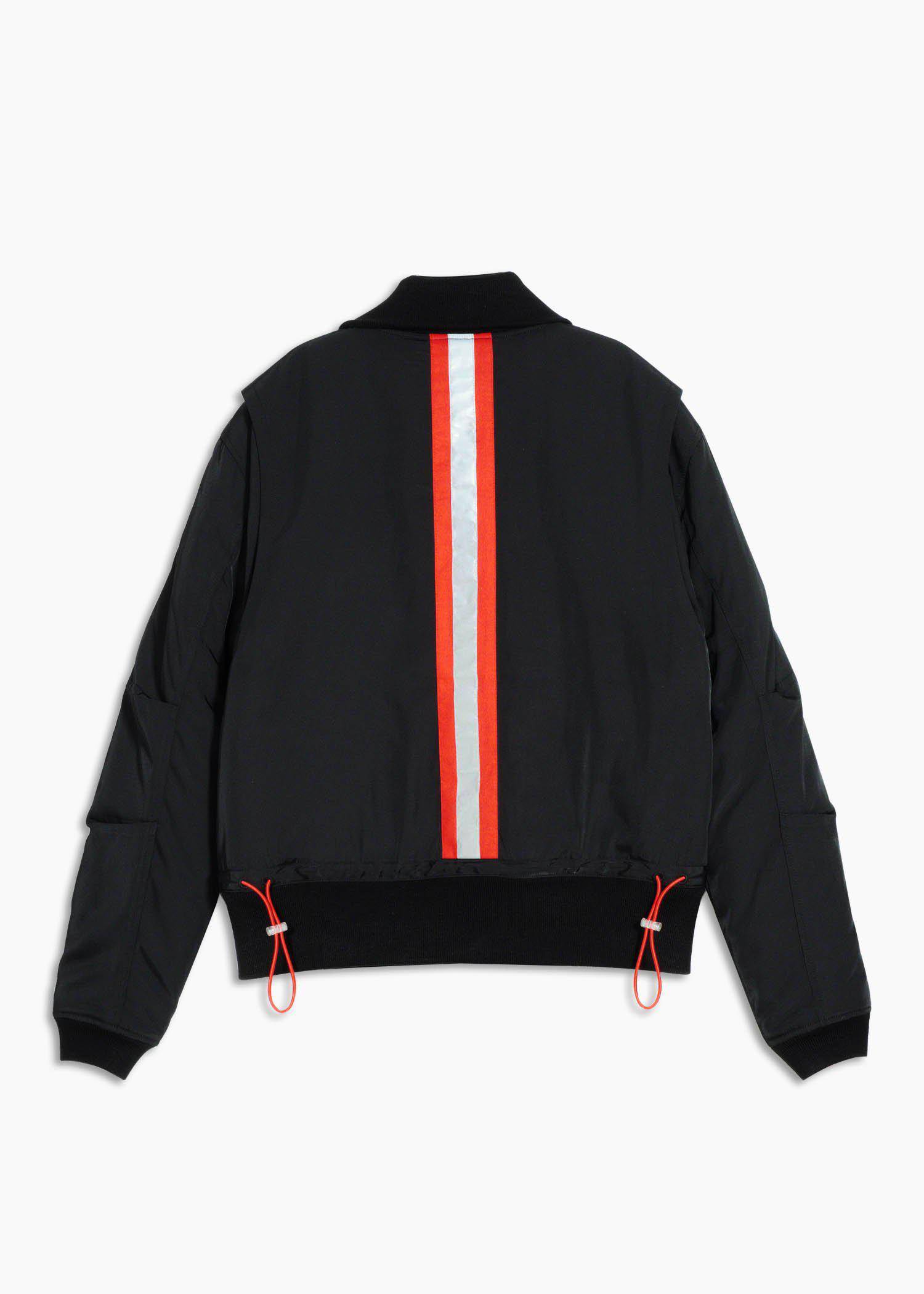 red elastic cord at the waist for adjustment and red/reflective tape on the back.