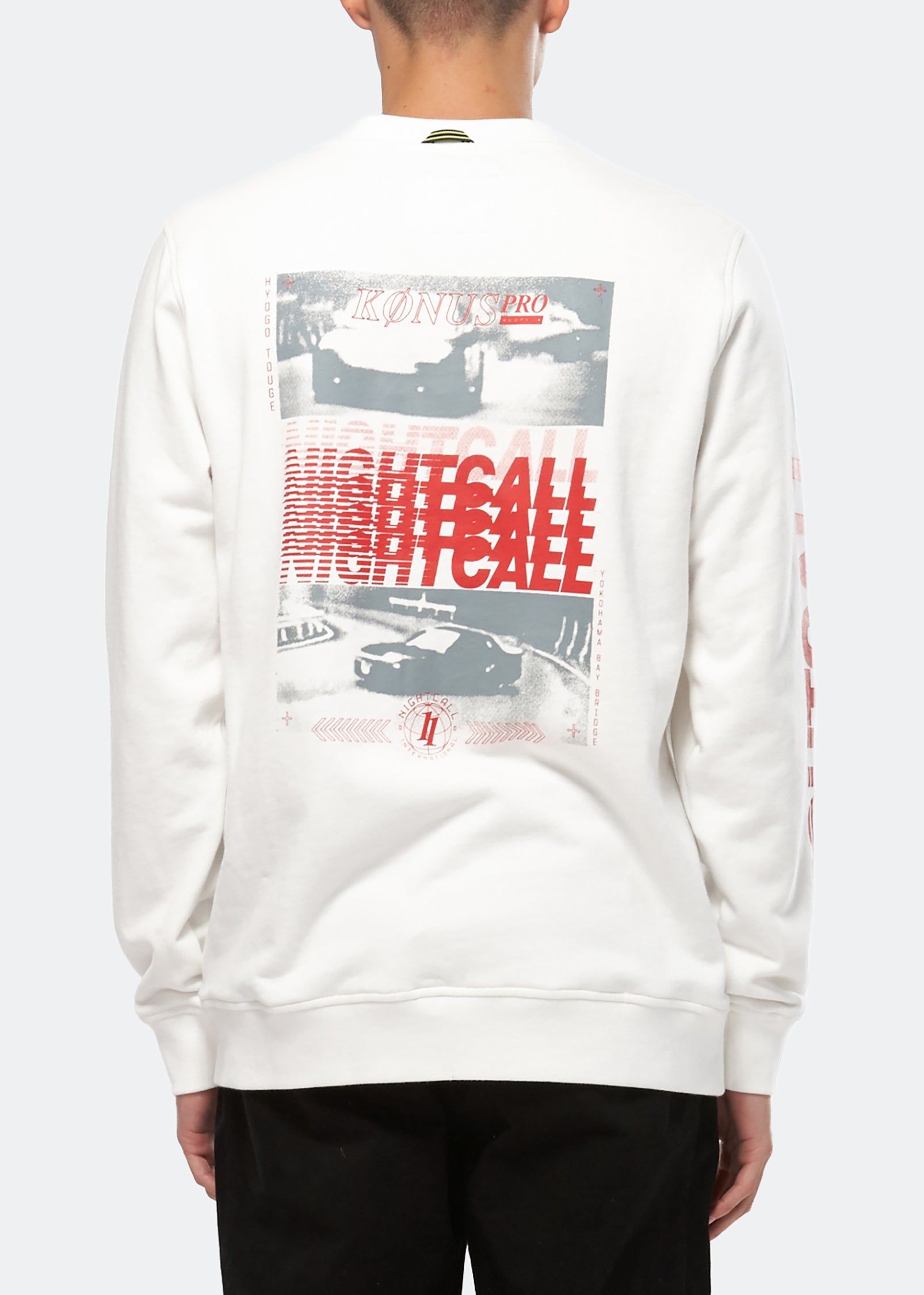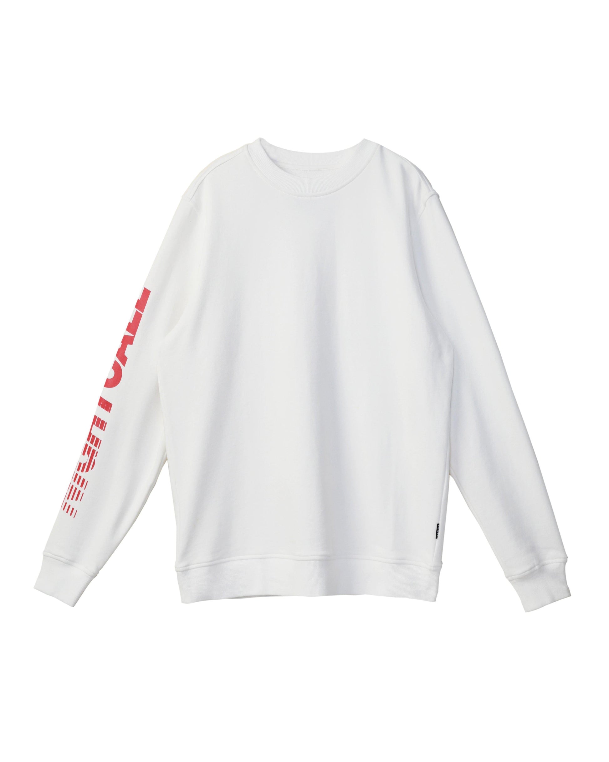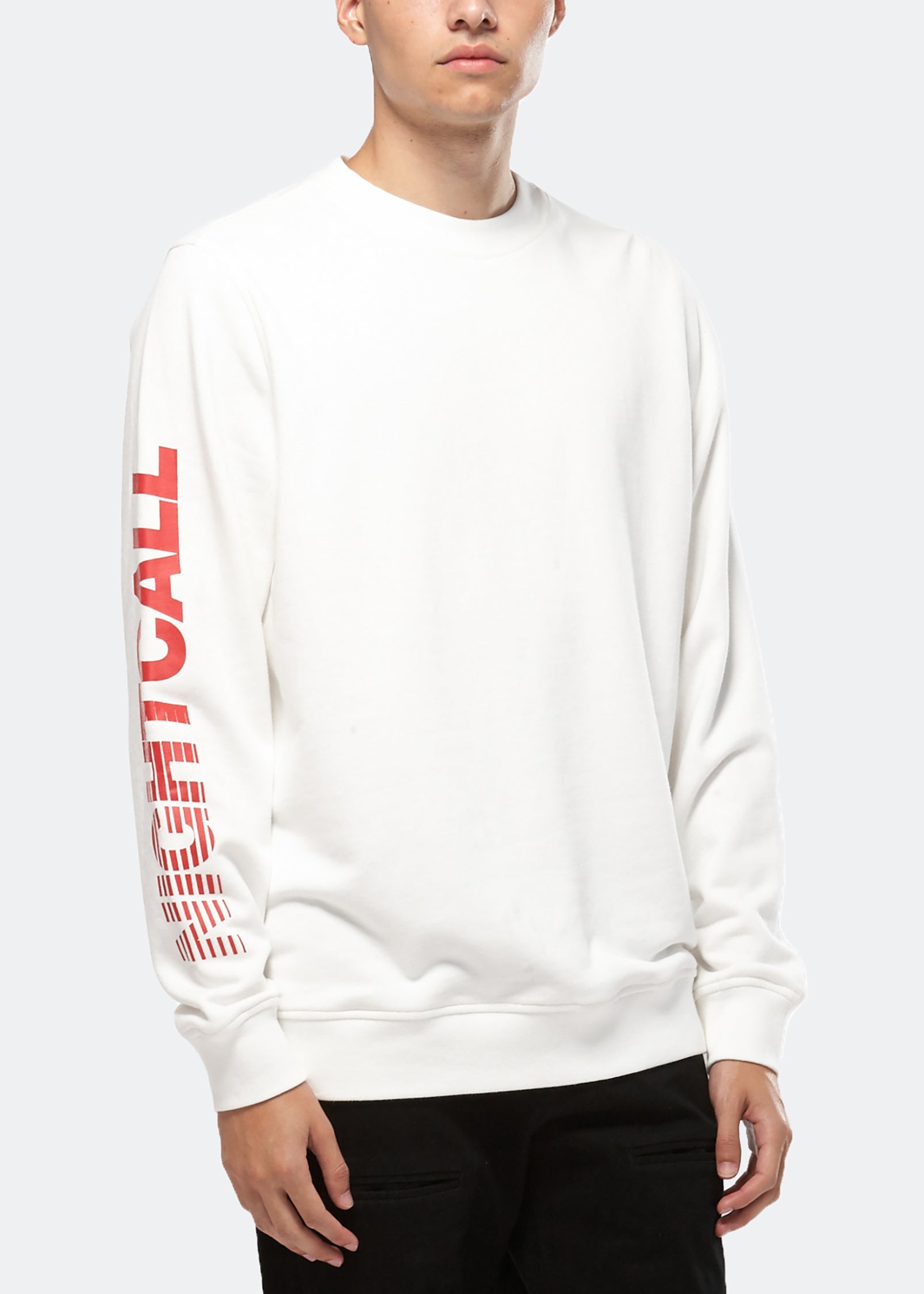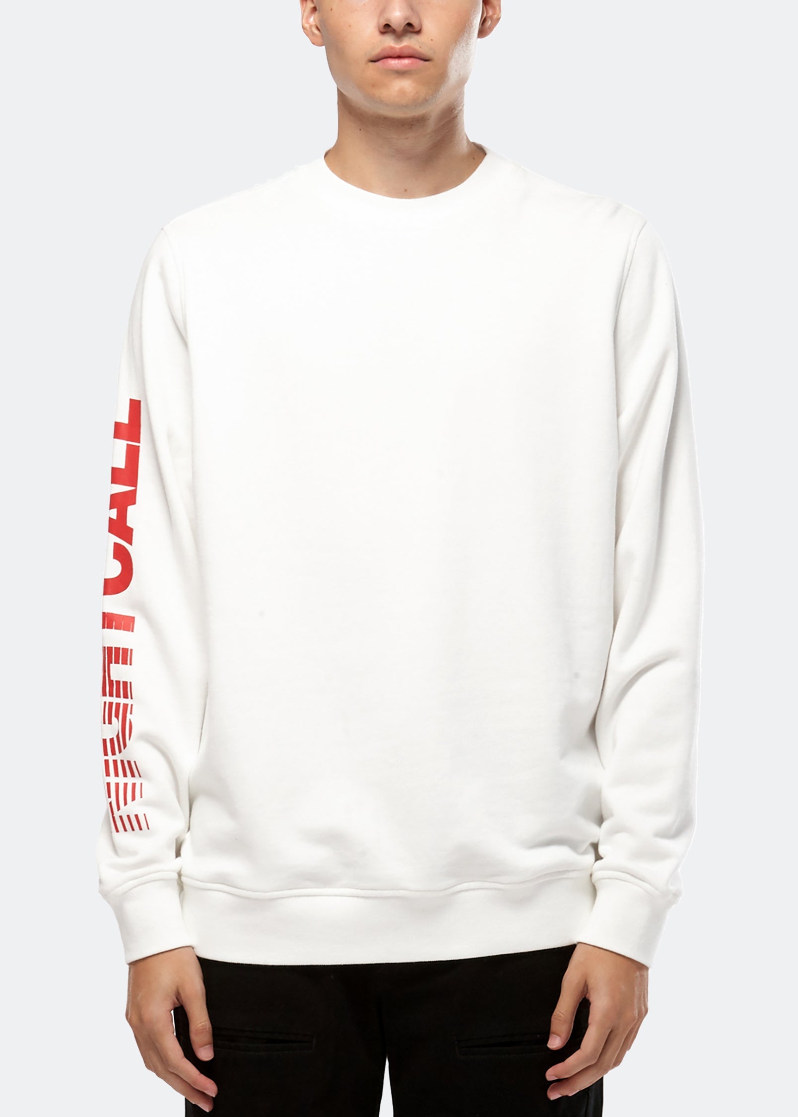 French terry sweatshirt with screen print on back and wearer's right sleeve